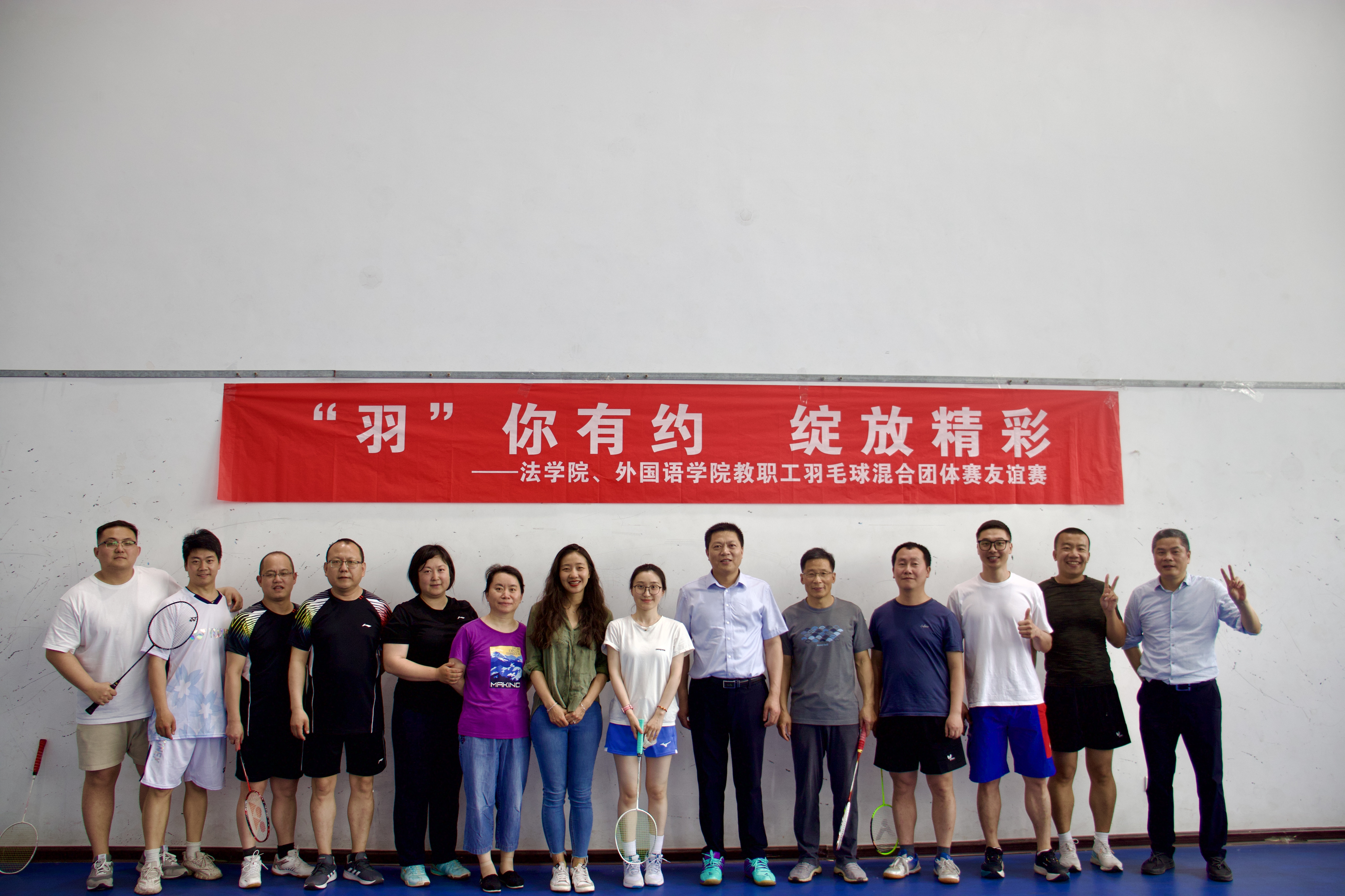 “羽”你有约,绽放精彩。5月22日下午,外国语学院与法学院教职工羽毛球混合团体友谊赛在扬子津校区文体馆举行。本次活动由外国语学院工会与法学院工会联合举办,外国语学院副院长杨晓春出席并主持活动。