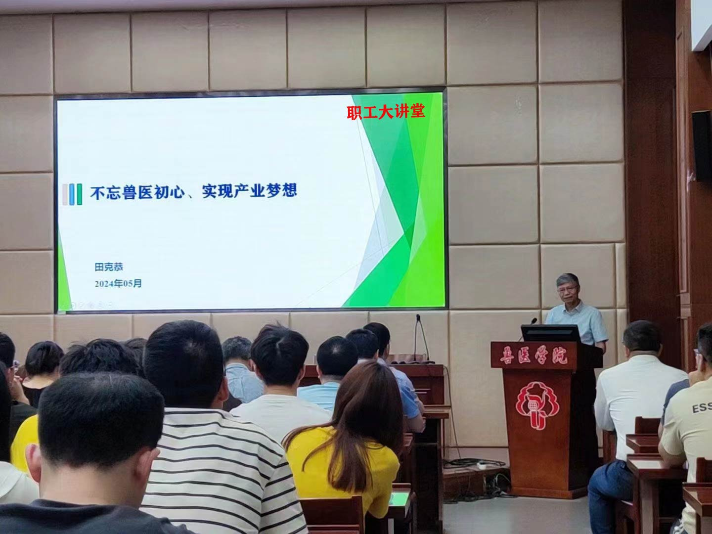 2024年5月底,兽医学院工会特邀河南农业大学特聘教授、普莱柯公司副总经理、首席科学家田克恭教授开展了“不忘兽医初心,实现产业梦想”为主题的职工大讲堂活动。全院教师约80人参加了此次活动。