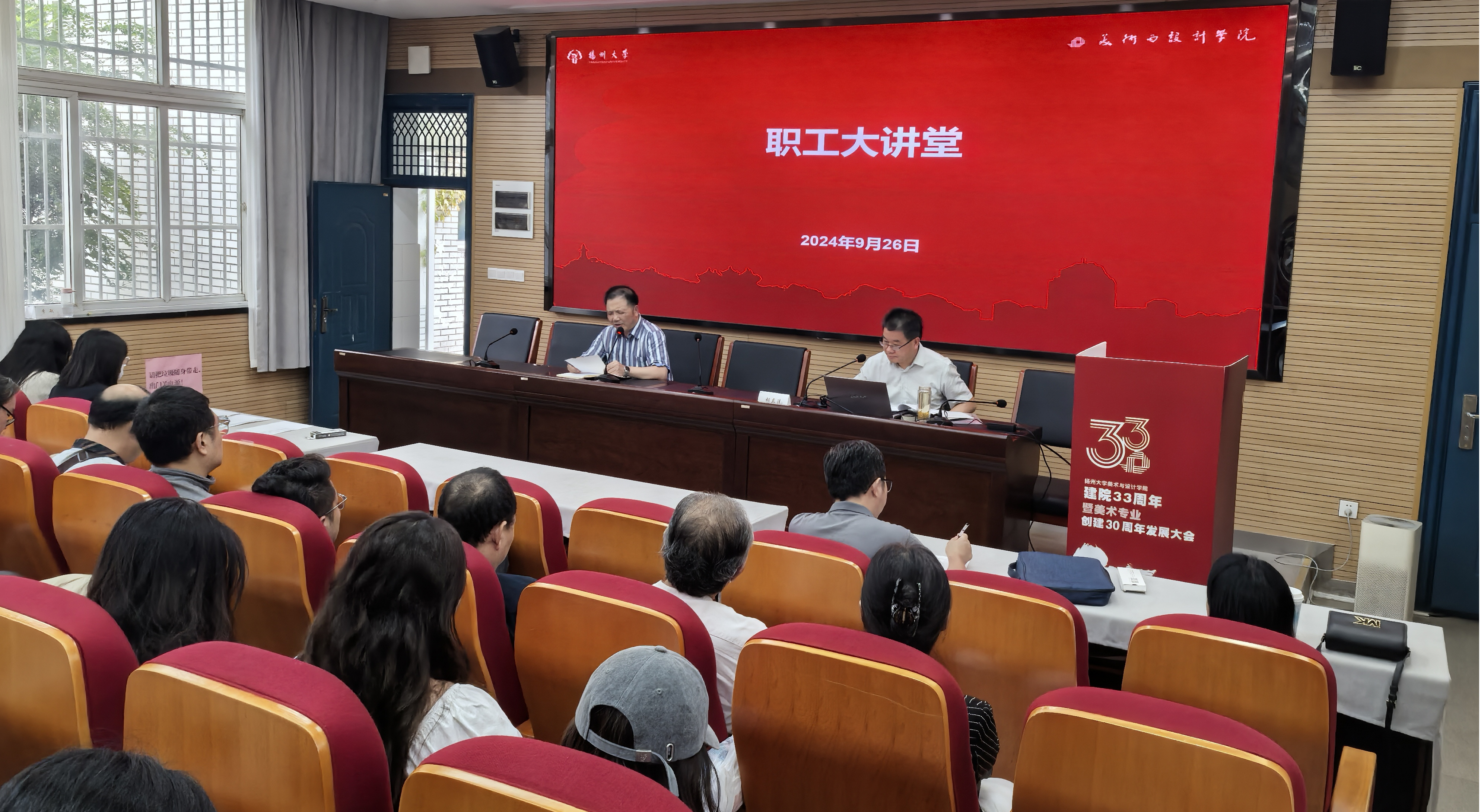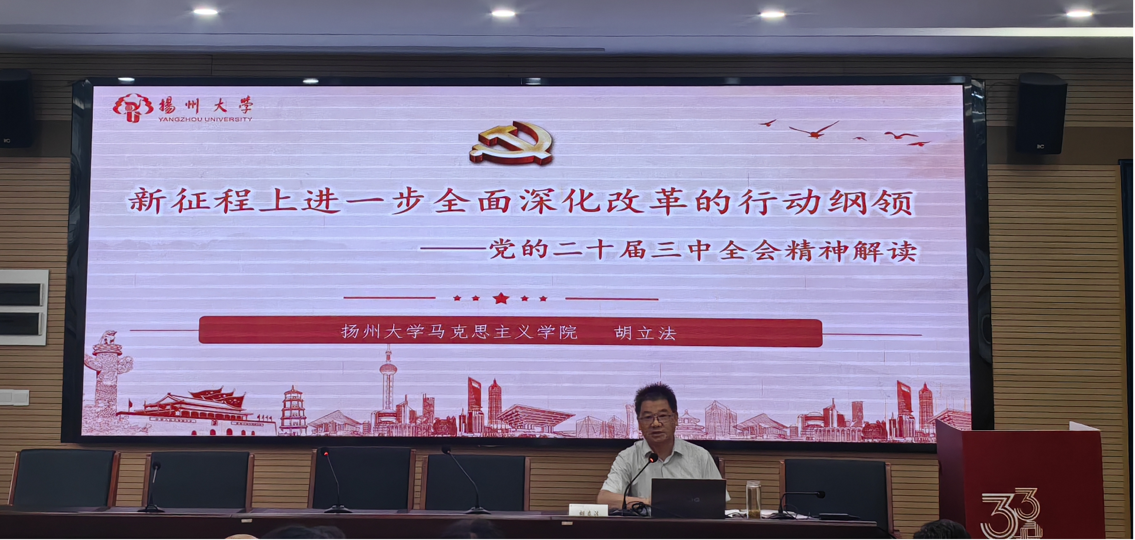 9月26日下午,美术与设计学院工会在学院报告厅开展职工大讲堂活动,专题学习贯彻党的二十届三中全会精神,讲堂邀请马克思主义学院胡立法院长做专题报告,党委李向阳书记主持活动并讲话。