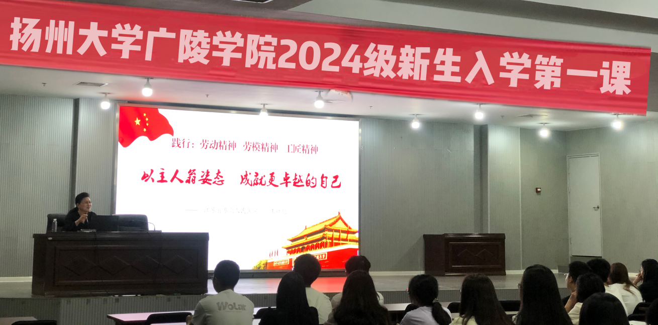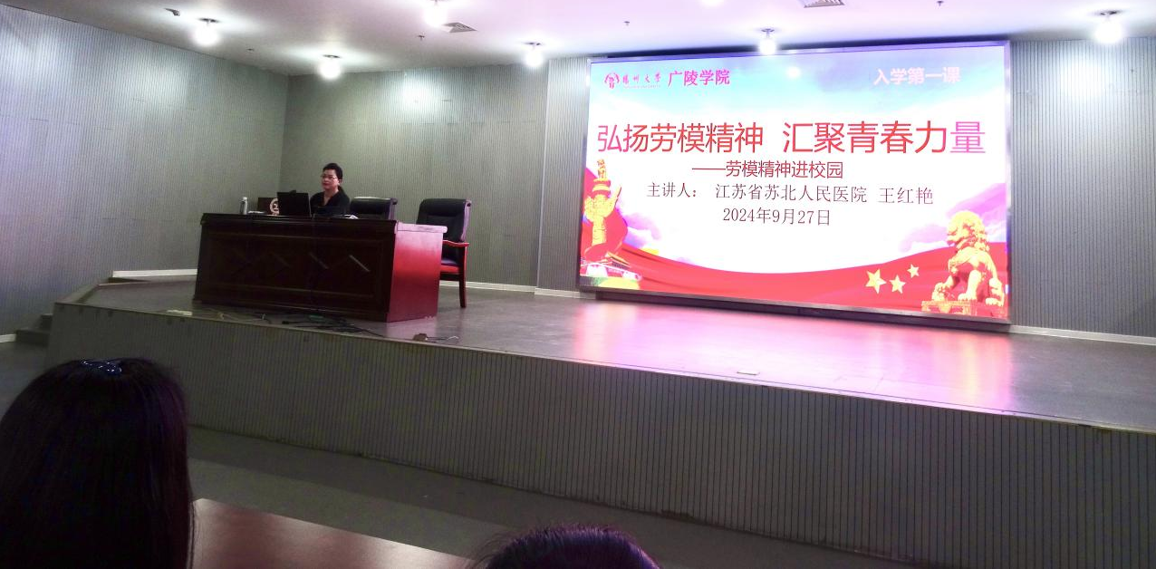 9月27日晚,广陵学院工会举办了2024级新生入学第一课“弘扬劳模精神 汇聚青春力量——劳模精神进校园”专题教育报告会,苏北人民医院义工教授王红艳应邀主讲,广陵学院化药系护理专业2024级新生到场听讲。