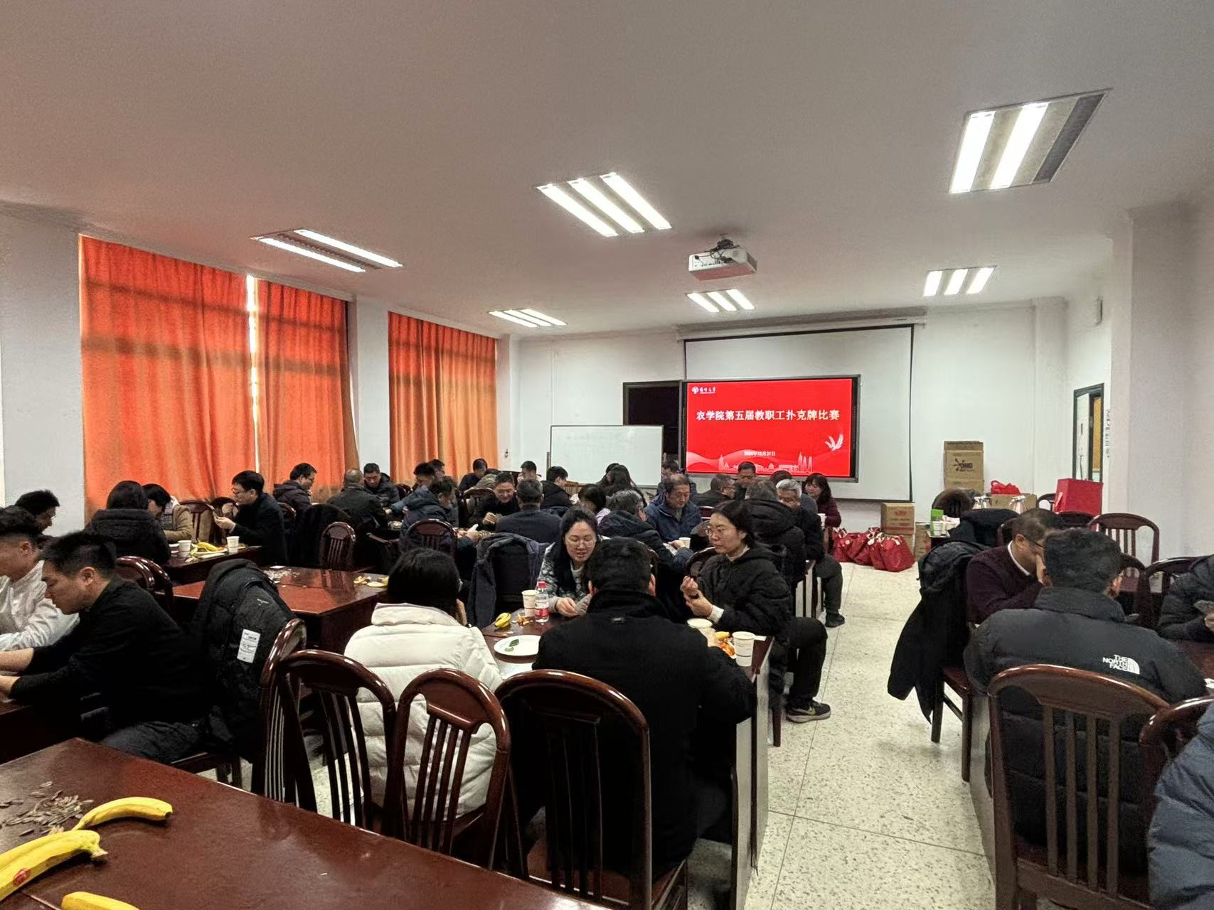 为丰富教职工业余文化生活,进一步增进工会会员间相互交流与学习,农学院于2025年元旦前夕举办了第五届教职工扑克牌掼蛋比赛。院党委书记李卫星、副书记周立云、副院长陆大雷、魏海燕、工会主席张祥等参加活动。