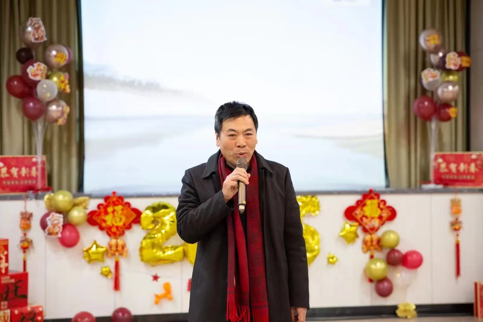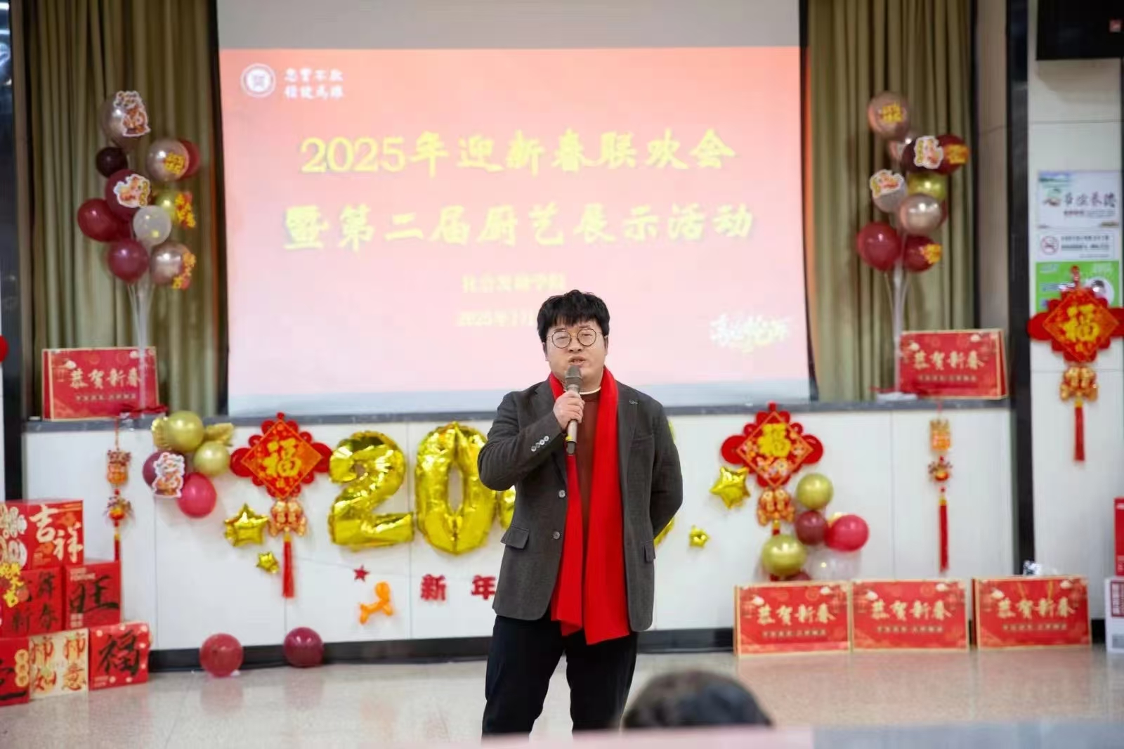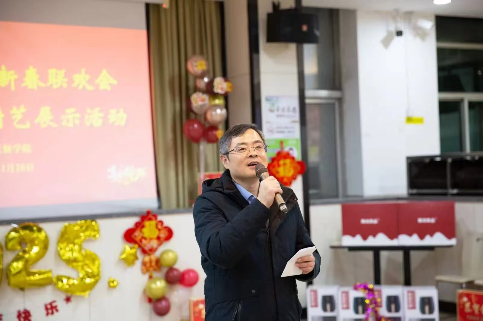 晚会开始,院党委书记林超致新年贺词。他回顾过去一年,全院教师齐心协力、拼搏奋进,在教学、科研、人才培养等方面取得丰硕成果。新的一年,学院将锚定更高的目标全面发力。林超书记向全体教职工送上美好的新年祝福,现场气氛热烈,暖意融融。