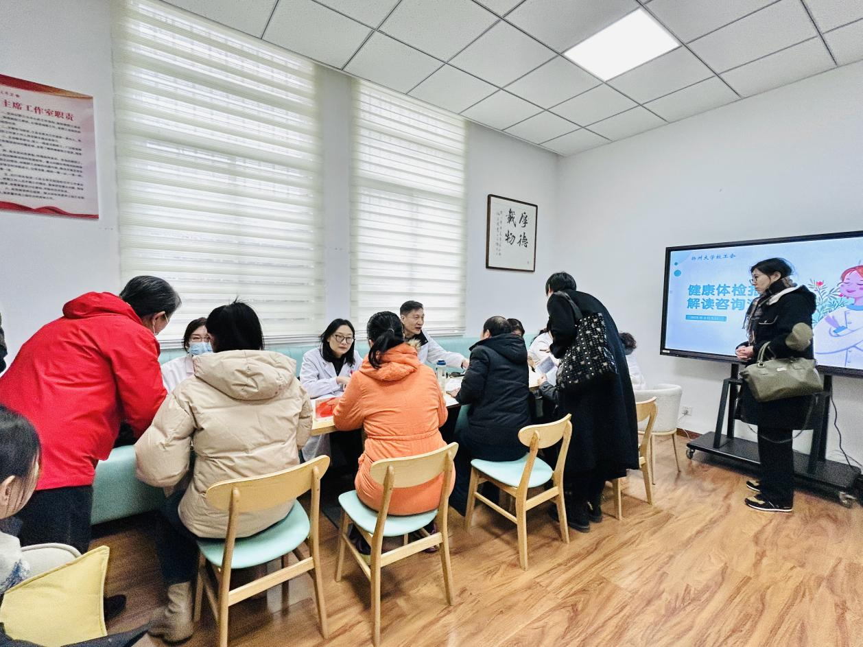 “以专业践行初心,以服务温暖人心。”活动特邀医学院教授、扬州大学附属医院消化科肖炜明主任,扬州大学附属医院心血管内科骆秋平主任,扬州大学附属医院甲乳外科张凤霞主任,扬州大学附属医院妇科丁艳主任,医学院教师、扬州大学附属医院中医科冯璇老师等多位名医专家为教职工提供专业问诊服务。活动现场还提供了血压血糖检测、妇产儿科健康科普、中医养生茶饮和养生艾草锤免费发放等服务项目。一位女职工深有感触地说:“中医问诊与西医诊断的结合,让我深刻体会到医学院师生的专业素养与热情服务,内心感到无比踏实!”此次义诊活动在医学院师生与学校教职工之间搭建了一座坚实的健康桥梁。