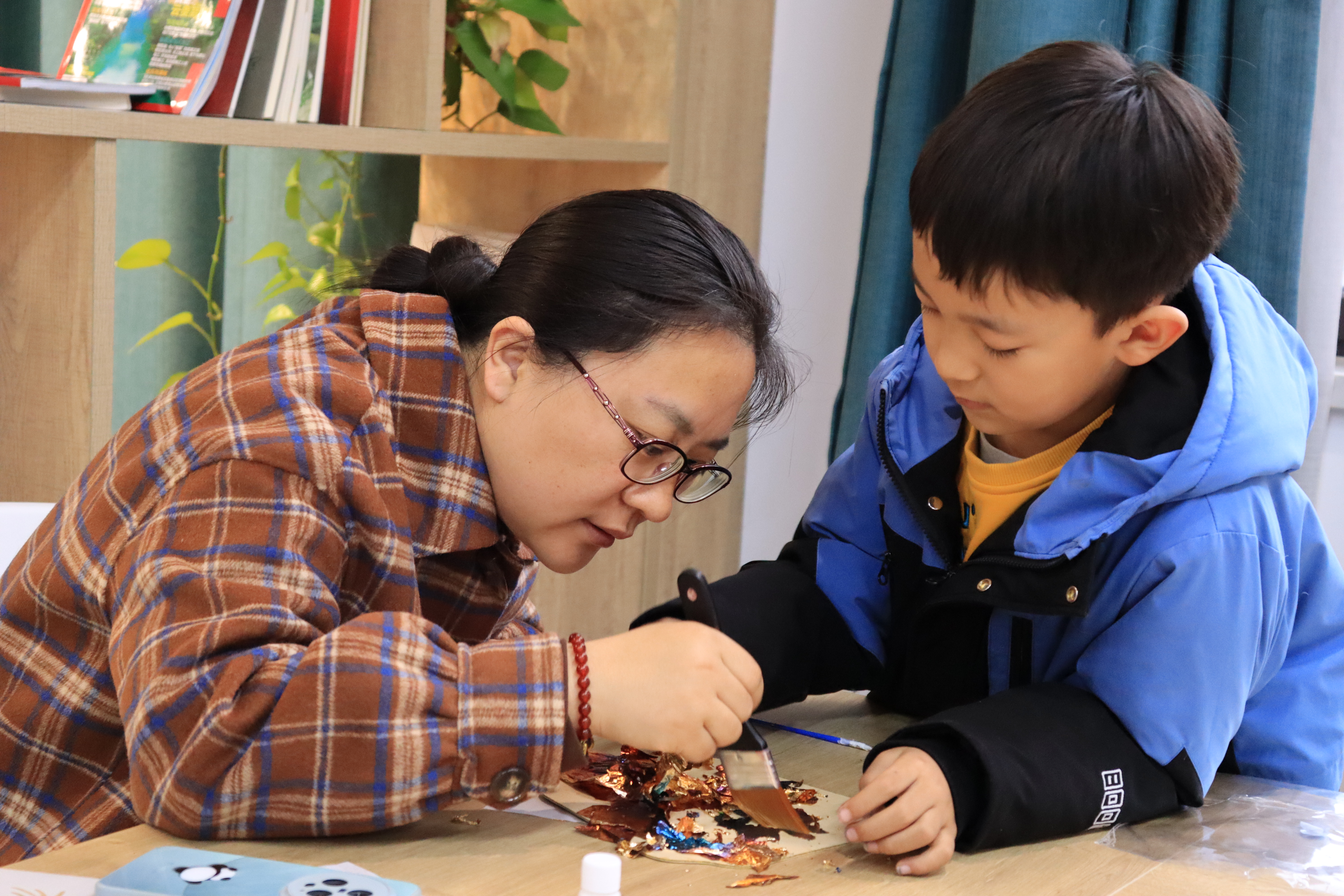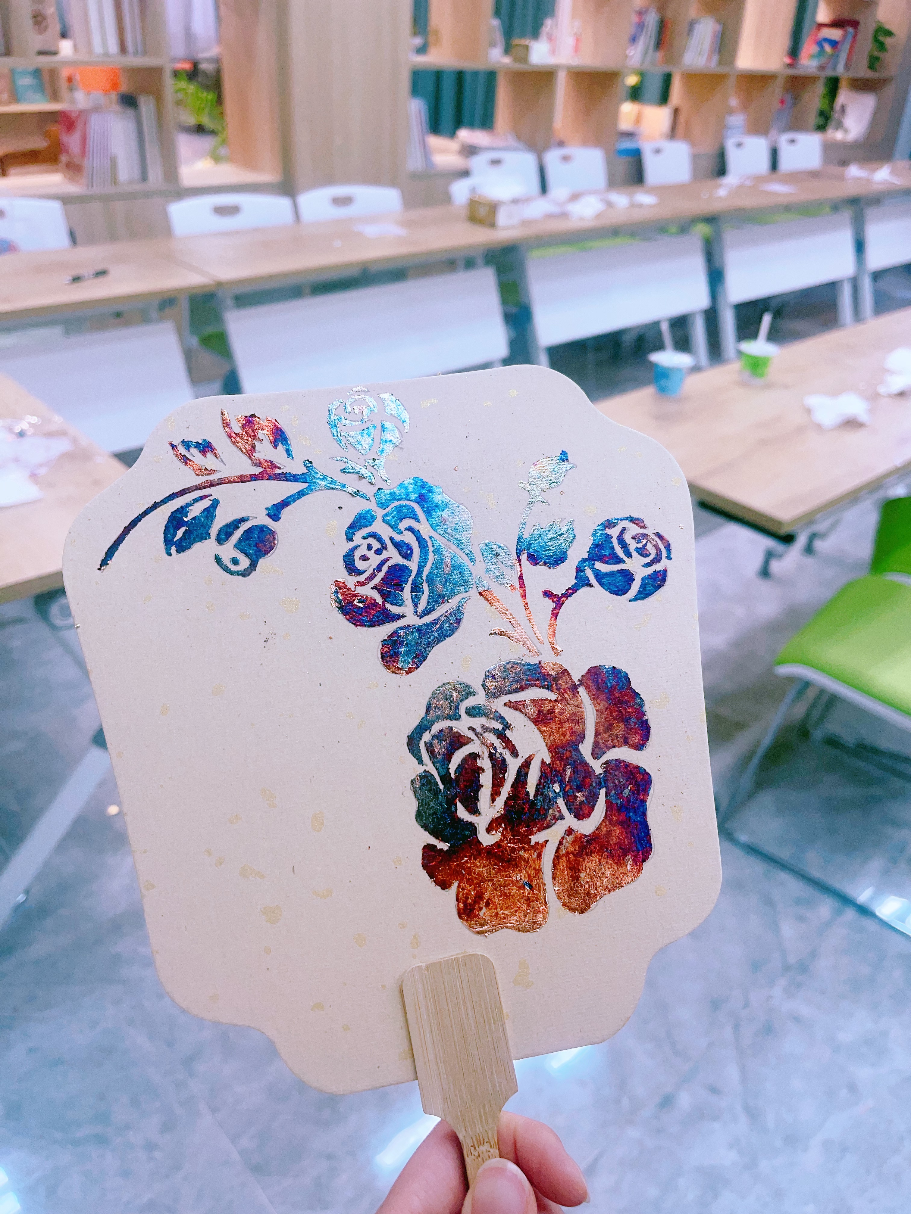 活动现场,指导老师通过图文并茂的方式,详细讲解了烧箔工艺的历史渊源与制作流程。烧箔工艺作为我国传统金属加工工艺的重要分支,通过高温煅烧使金属箔呈现出独特的肌理纹路。在老师的指导下,女职工及子女们手持专用工具,小心翼翼地对铜箔进行炙烤塑形。随着温度升高,原本平整的金属箔逐渐蜷曲变色,形成如流云般的自然纹理,再经过裁剪、粘贴、装饰等工序,一把把精美的烧箔团扇雏形初现。