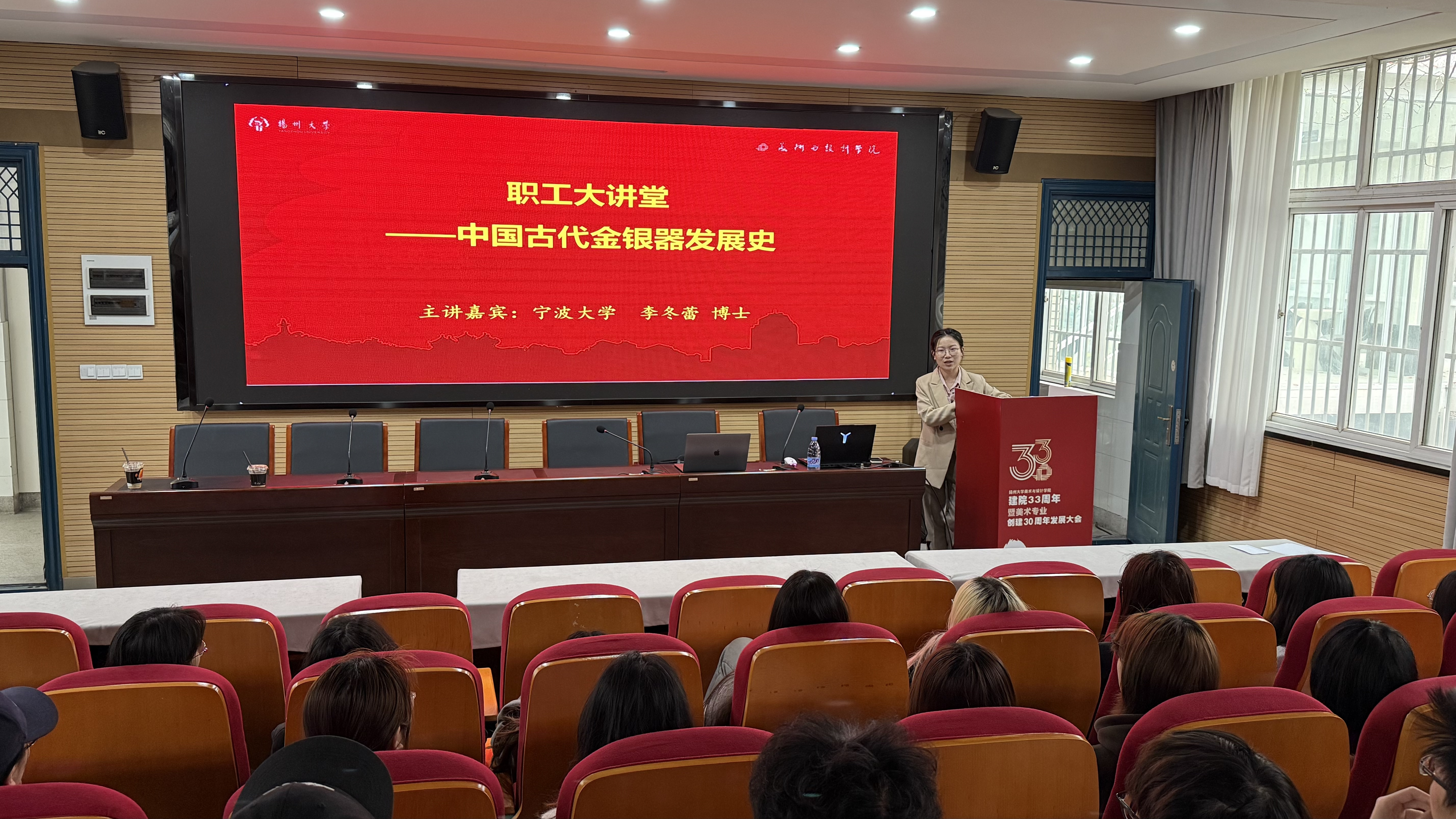 3月27日下午,美术与设计学院工会为全院老师举办了“中国古代金银器发展史”职工大讲堂活动,活动邀请宁波大学李冬蕾博士就古代艺术典范之一——卓越的金银器艺术为切入点,为大家讲解了古代劳动人民如何通过精湛的金属工艺体现他们的智慧和创造力,通过领略古代工匠的高超技艺及其独特的艺术价值,关注到中国传统文化,为老师们今后在各类设计作品中传承和弘扬中国传统文化的历史价值和人文价值打开新的思路和视野。