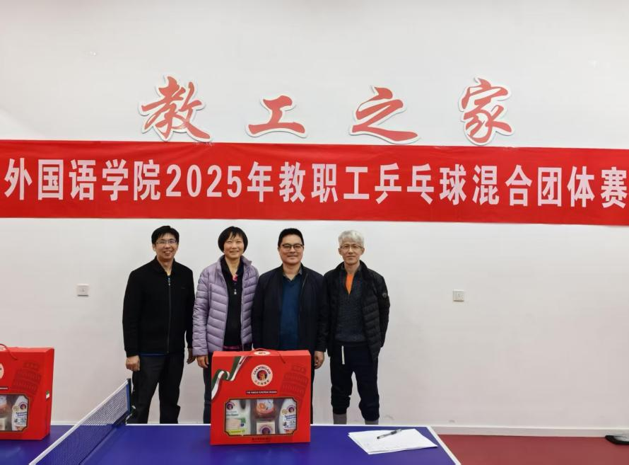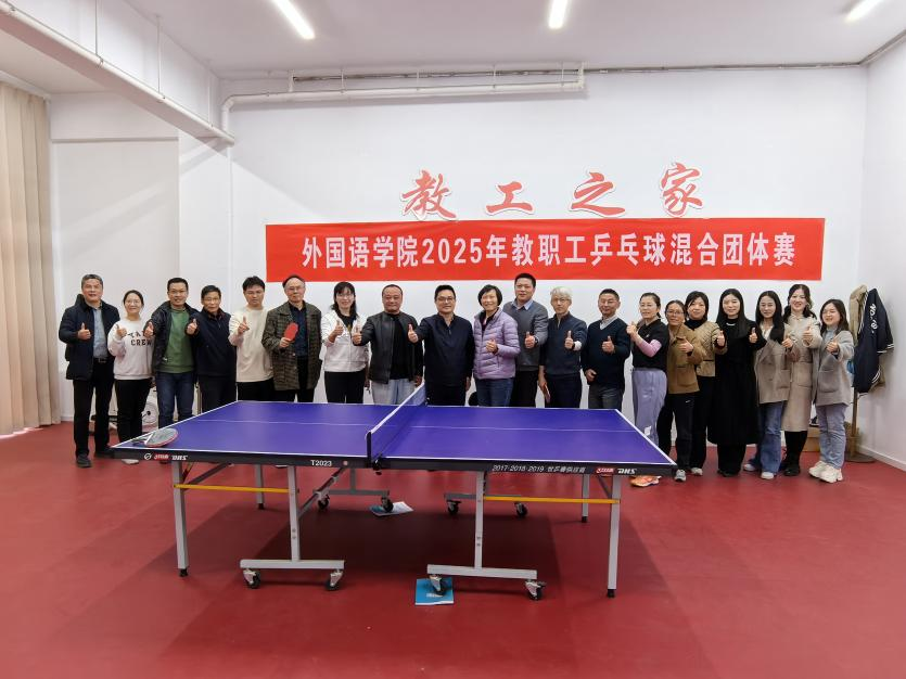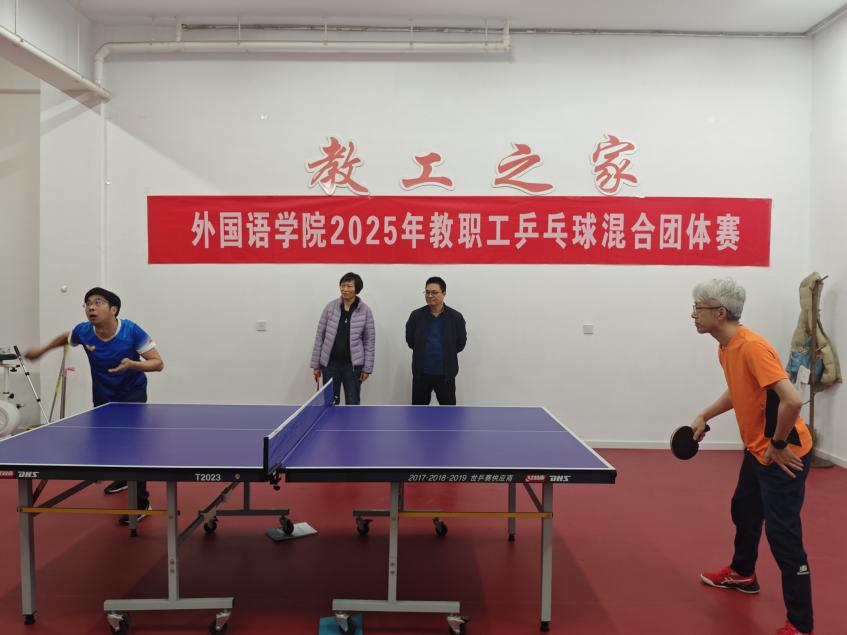 外国语学院2025年教职工乒乓球混合团体赛于4月2日在笃行楼工会活动室举办。院行政人员与大学外语教学部组成外院1队,英语及非通用语种各专业教职工组成外院2队。学院党委书记居学明、副院长杨晓春参加活动。