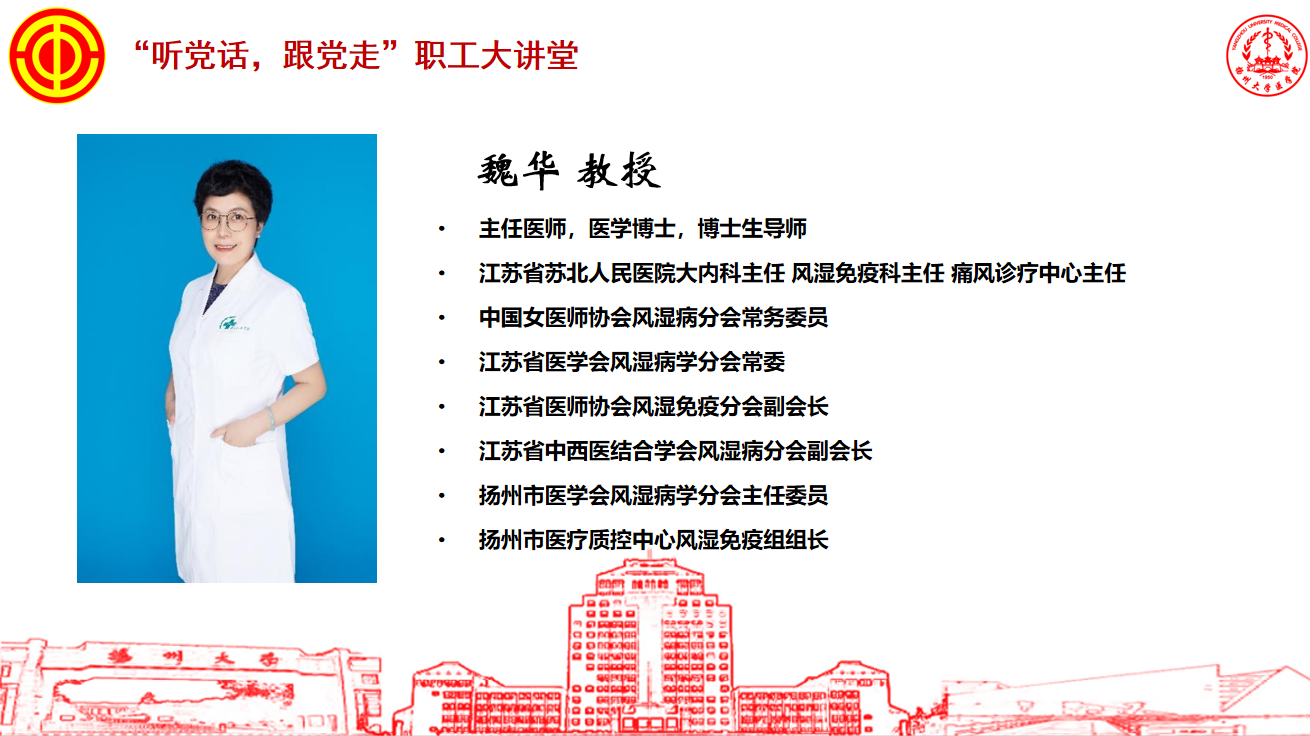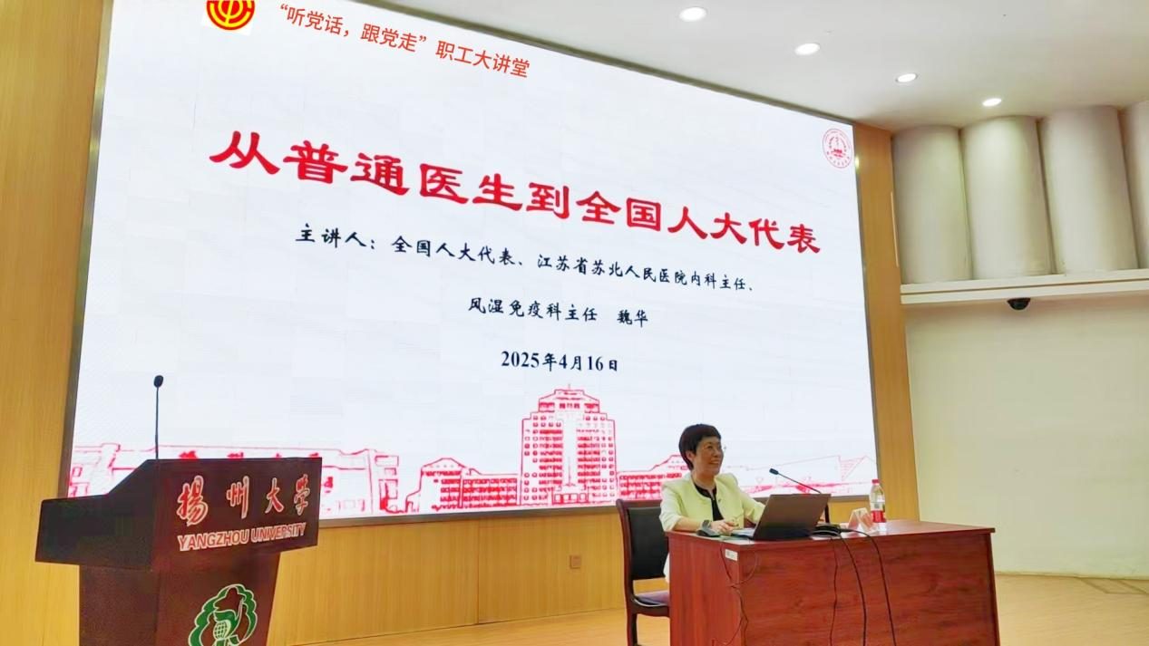 2025年4月16日下午5时,医学院职工大讲堂活动在荷花池校区逸夫报告厅举行,全国人大代表、苏北人民医院内科主任兼风湿免疫科主任魏华以“从普通医生到全国人大代表”为主题,为医学院教职工及学生代表带来了一场充满温度与力量的分享。