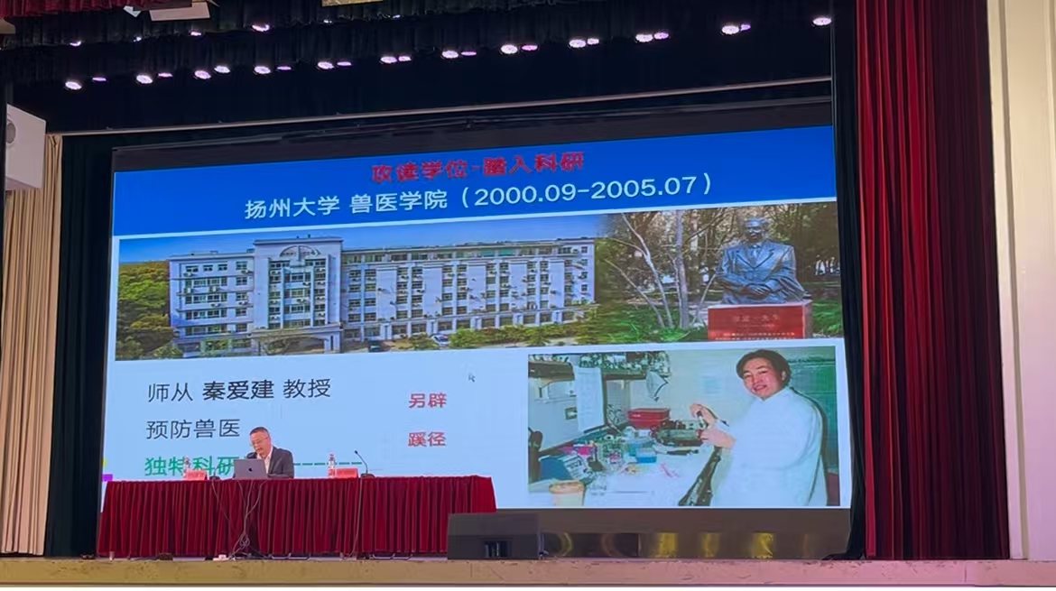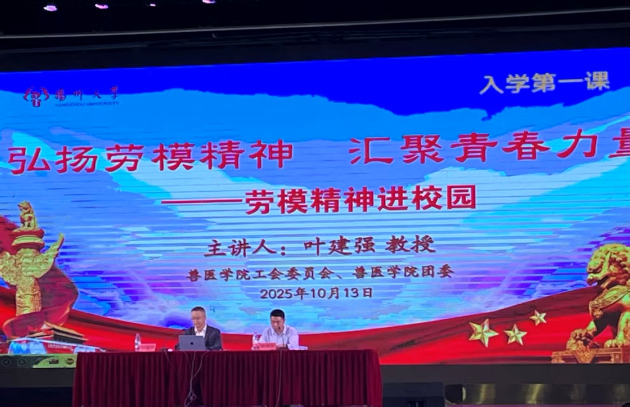 2025年10月13日晚,由兽医学院工会委员会和兽医学院团委共同举办的主题为“弘扬劳模精神,汇聚青春力量”劳模精神进校园入学教育讲座,在文汇路校区大礼堂顺利举办,本次讲座特别邀请兽医学院国家“百千万人才工程”人选、江苏省“333工程”第二层次培养对象、“国家有突出贡献中青年专家”、扬州市“先进工作者”和“最美扬大教师”叶建强教授担任主讲人,分享自己的故事。