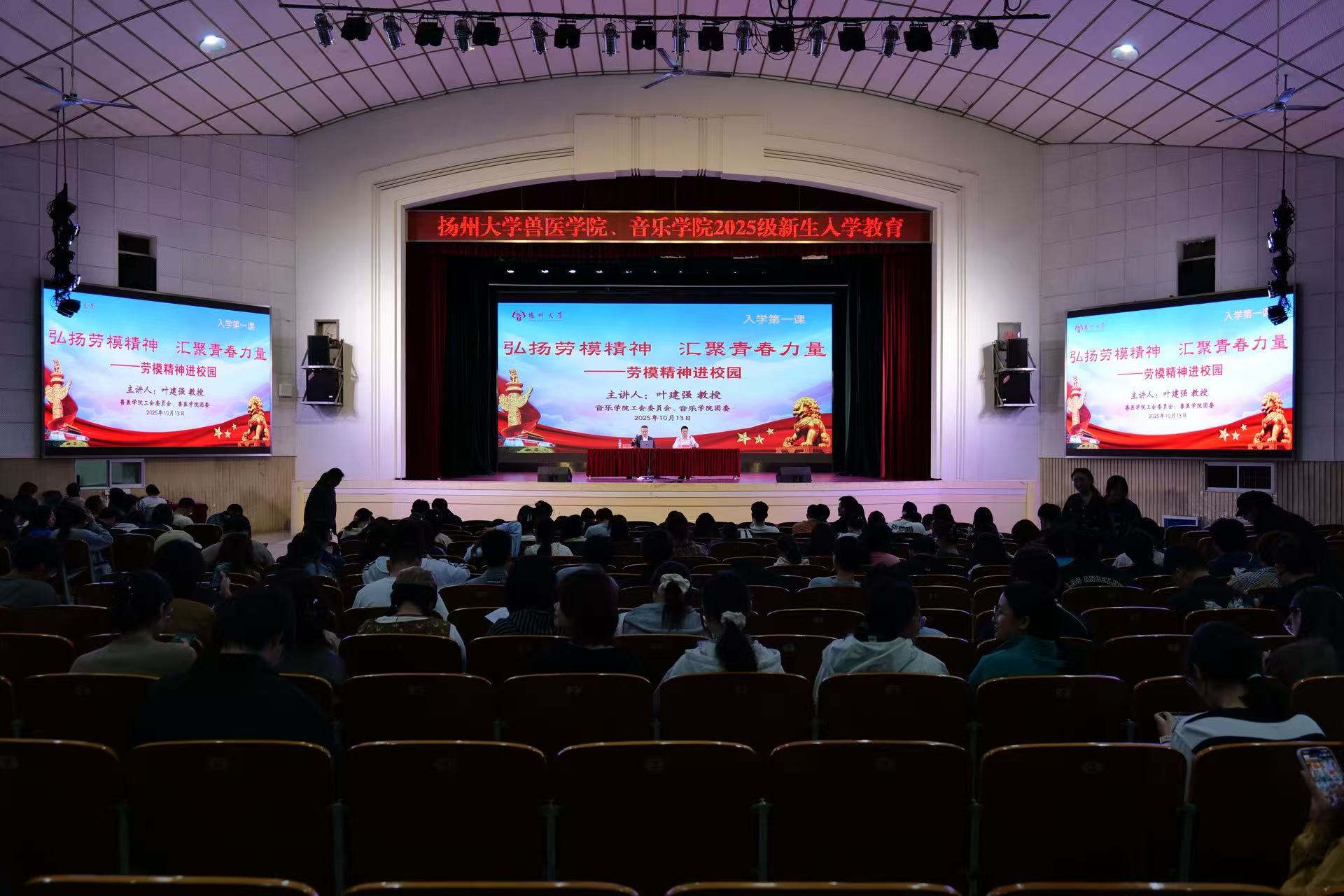 2025年10月13日晚在文汇路校区大礼堂,由音乐学院工会委员会和音乐学院团委共同举办了主题为“弘扬劳模精神,汇聚青春力量”劳模精神进校园讲座,本次讲座特别邀请兽医学院国家“百千万人才工程”人选、江苏省“333工程”第二层次培养对象、“国家有突出贡献中青年专家”、扬州市“先进工作者”和“最美扬大教师”叶建强教授担任主讲人。