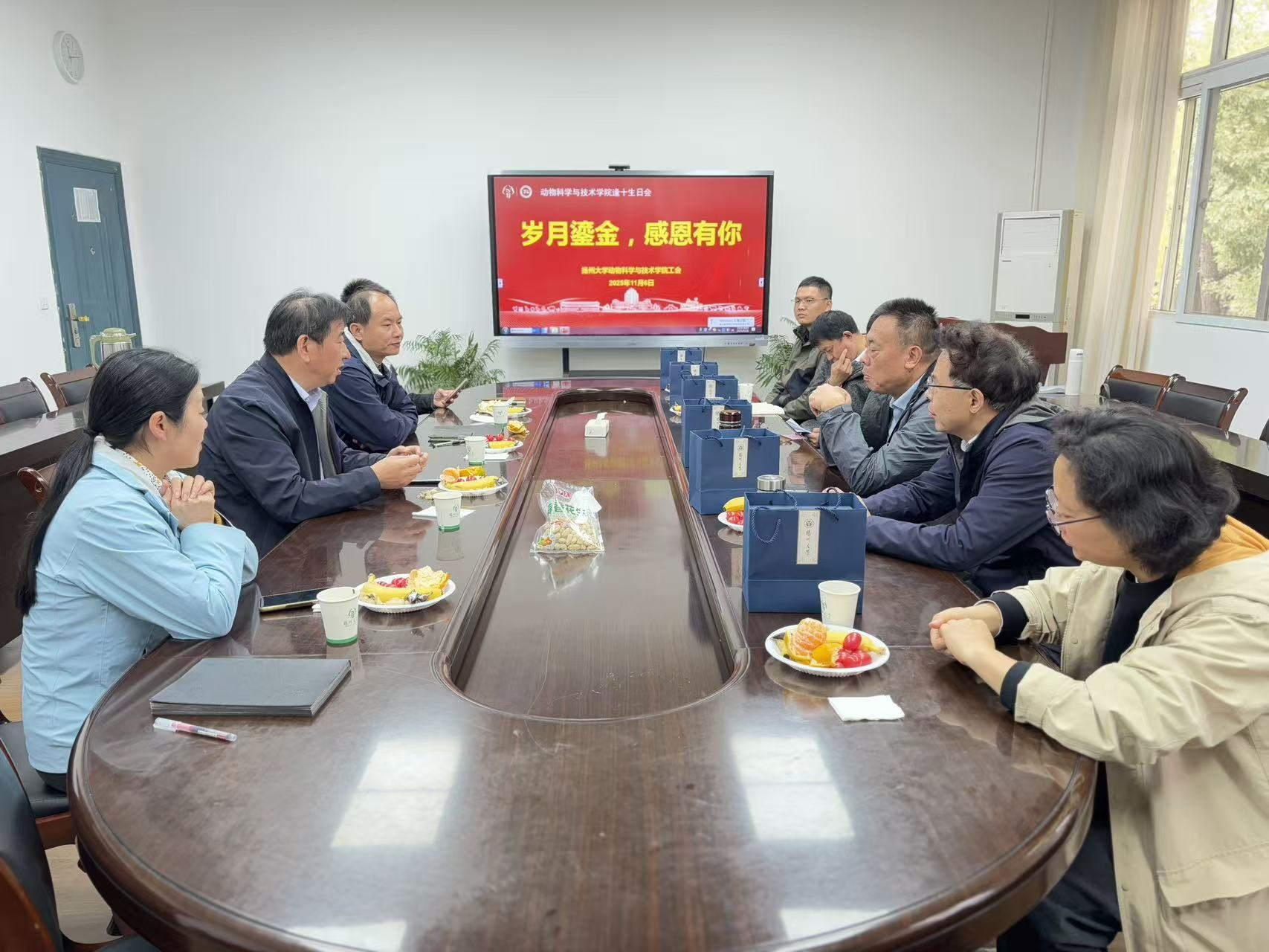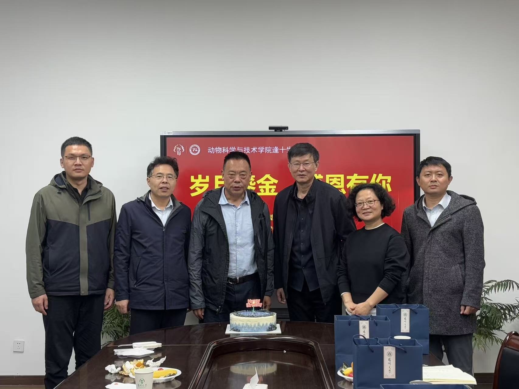 为弘扬尊师重教、关爱教职工的优良传统,营造温馨和谐的学院文化氛围,2025年11月6日上午,扬州大学动物科学与技术学院工会在文汇路校区28号楼206会议室成功举办了以“岁月鎏金,感恩有你”为主题的逢十生日会活动。学院领导、工会成员以及1965年、1975年、1985年、1995年出生的“逢十”寿星教职工齐聚一堂,共庆金色年华。