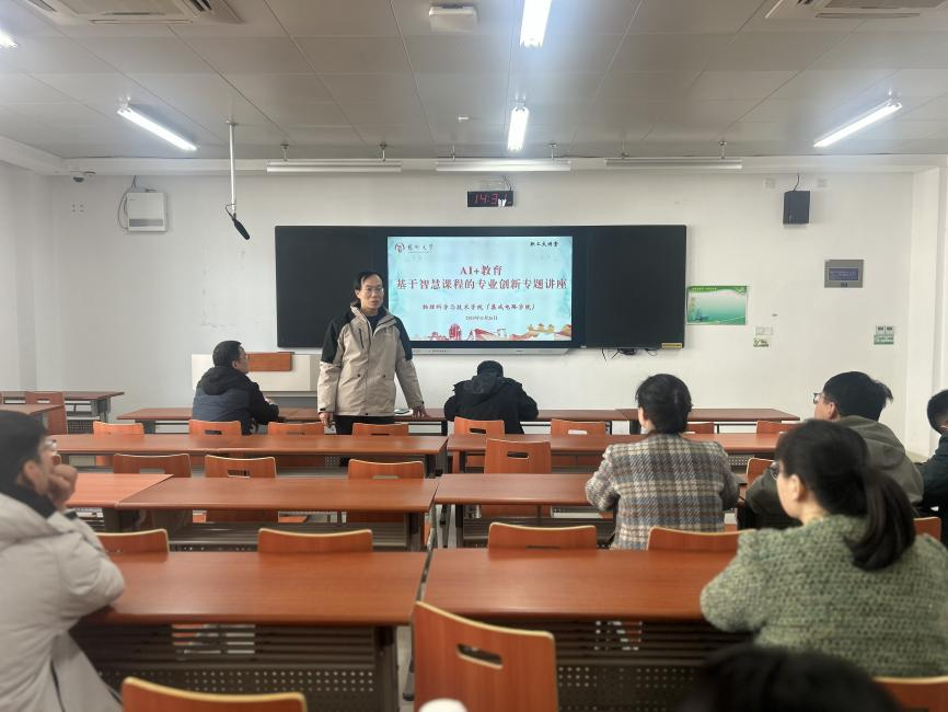 11月26日下午,物理科学与技术学院(集成电路学院)在瘦西湖校区8号楼S208成功举办了“AI+教育”基于智慧课程的专业创新专题讲座职工大讲堂。本次讲座旨在深入贯彻落实国家教育数字化战略部署,推动人工智能、大数据等新一代信息技术与专业教学深度融合,探索面向未来的智能化人才培养新模式。