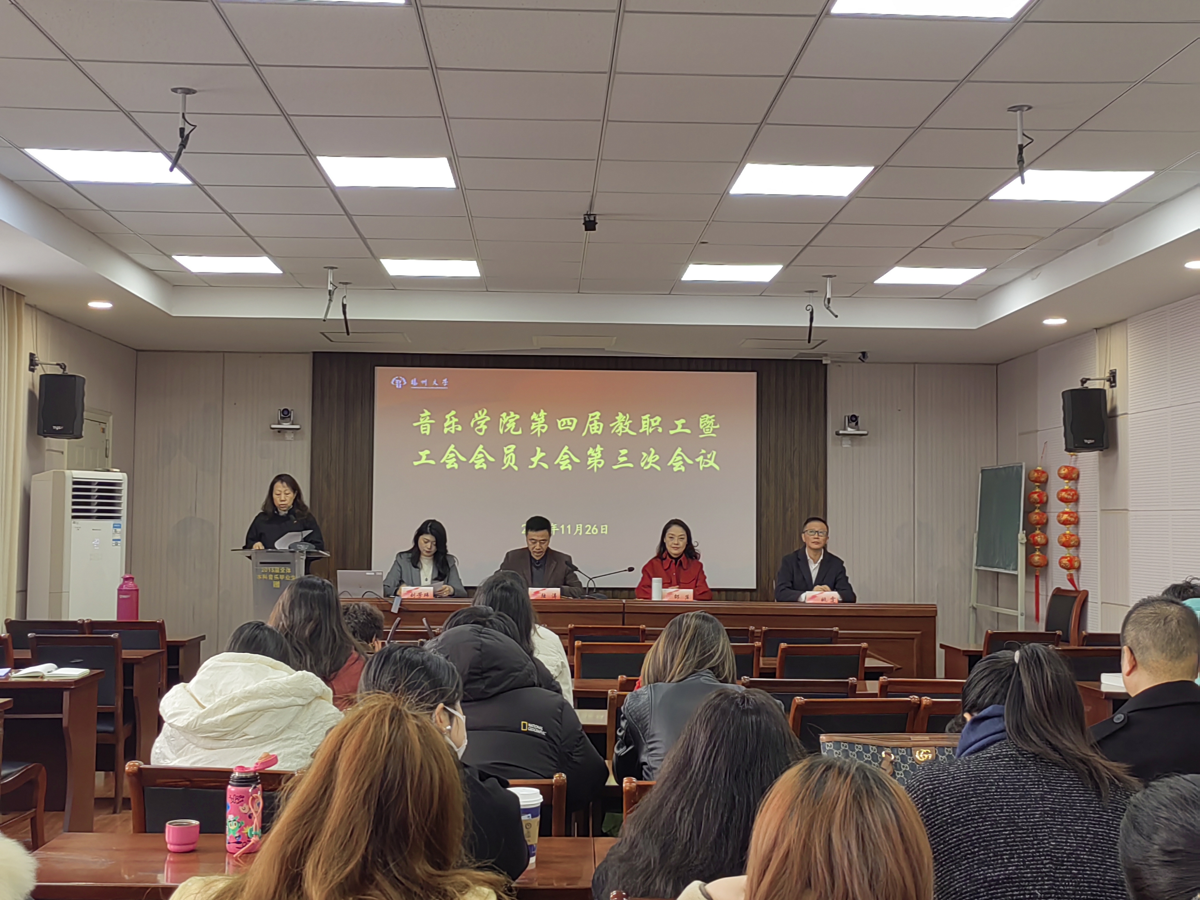 2025年11月26日,音乐学院第四届第三次教职工大会暨工会会员大会在学院美学堂隆重召开,全体院领导及工会会员参加会议,会议由学院党委副书记刘芳玮同志主持。