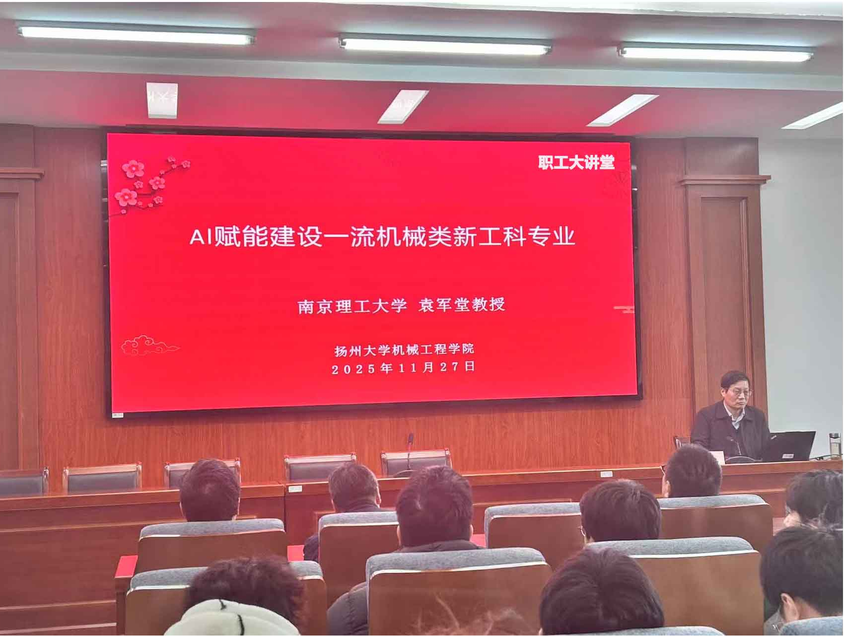 11月27日下午,机械学院在扬子津校区力行楼401报告厅举办“AI赋能建设一流机械类新工科专业”职工大讲堂活动。南京理工大学机械工程学院二级教授,“万人计划”教学名师,教育部课程思政教学名师袁军堂教授应邀主讲,学院百余名教师参加了学习。