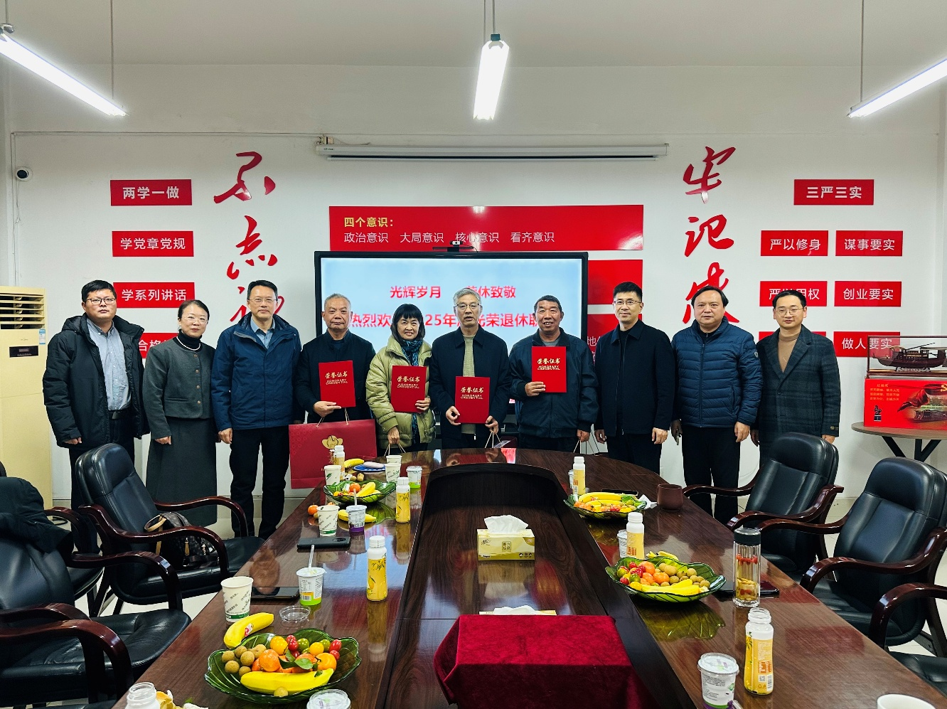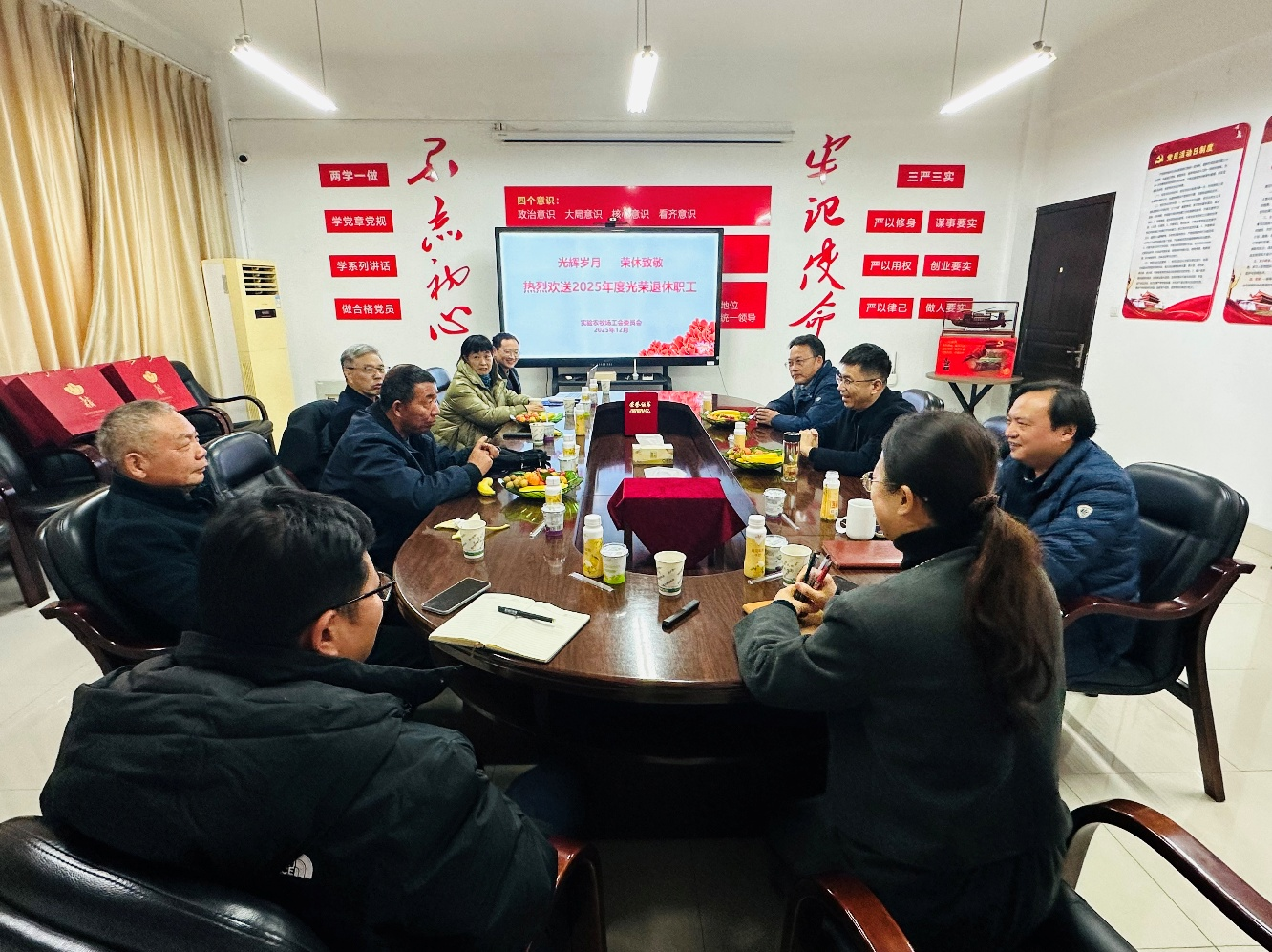 致敬光辉岁月,赓续奋斗精神。12月11日下午,实验农牧场在食品产业园场区开展2025年度退休职工荣退活动,向退休职工表达崇高敬意与诚挚问候。实验农牧场党总支书记朱春生、副书记周建华出席活动,工会主席吴慧主持活动。