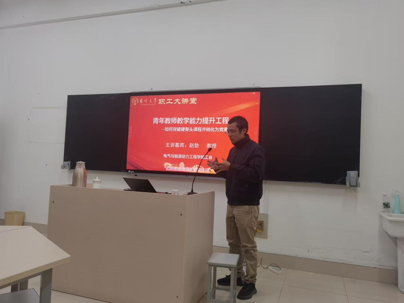 为深入推进青年教师教学能力提升工程,促进教学改革与创新,扬州大学电气与能源动力工程学院工会于2025年12月9日在知行楼S309举办了职工大讲堂系列活动,特邀南京邮电大学赵勃教授作专题报告,题为《从课到赛——如何破局硬骨头课程并转化为竞赛成果》。