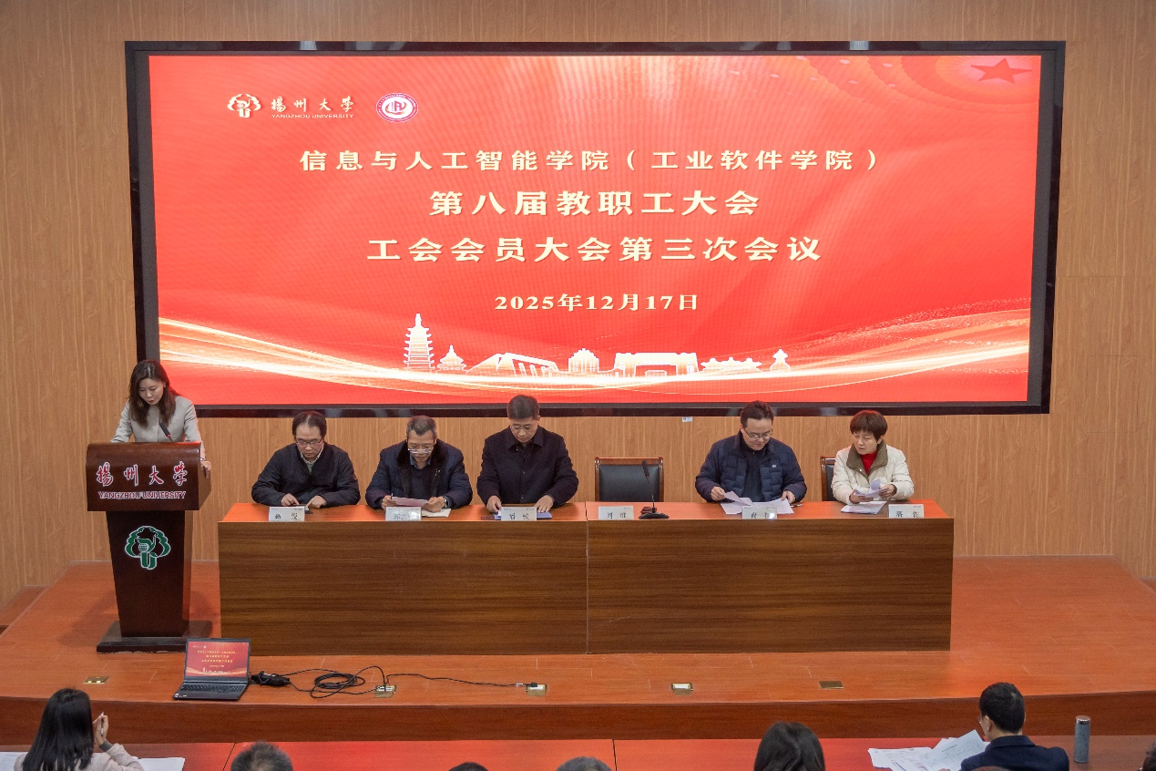 2025年12月17日下午,学院第八届工会会员大会第三次会议在东报告厅召开。党委书记潘骏、院长刘维、副院长郭志波、裔扬、高锐,工会主席潘钧及全体教职工参加会议。