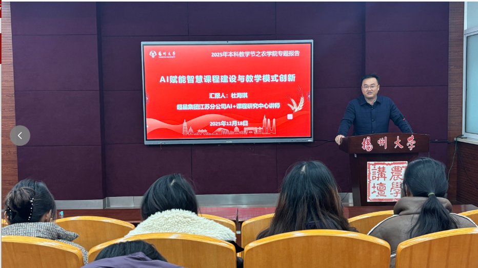 12月19日下午,农学院在文汇路校区农牧楼N127报告厅举办“AI赋能智慧课程建设与教学模式创新”专题讲座。本次讲座旨在深入贯彻落实国家教育数字化战略部署,推动人工智能与农学专业教学深度融合,探索面向未来的智能化教学模式创新。