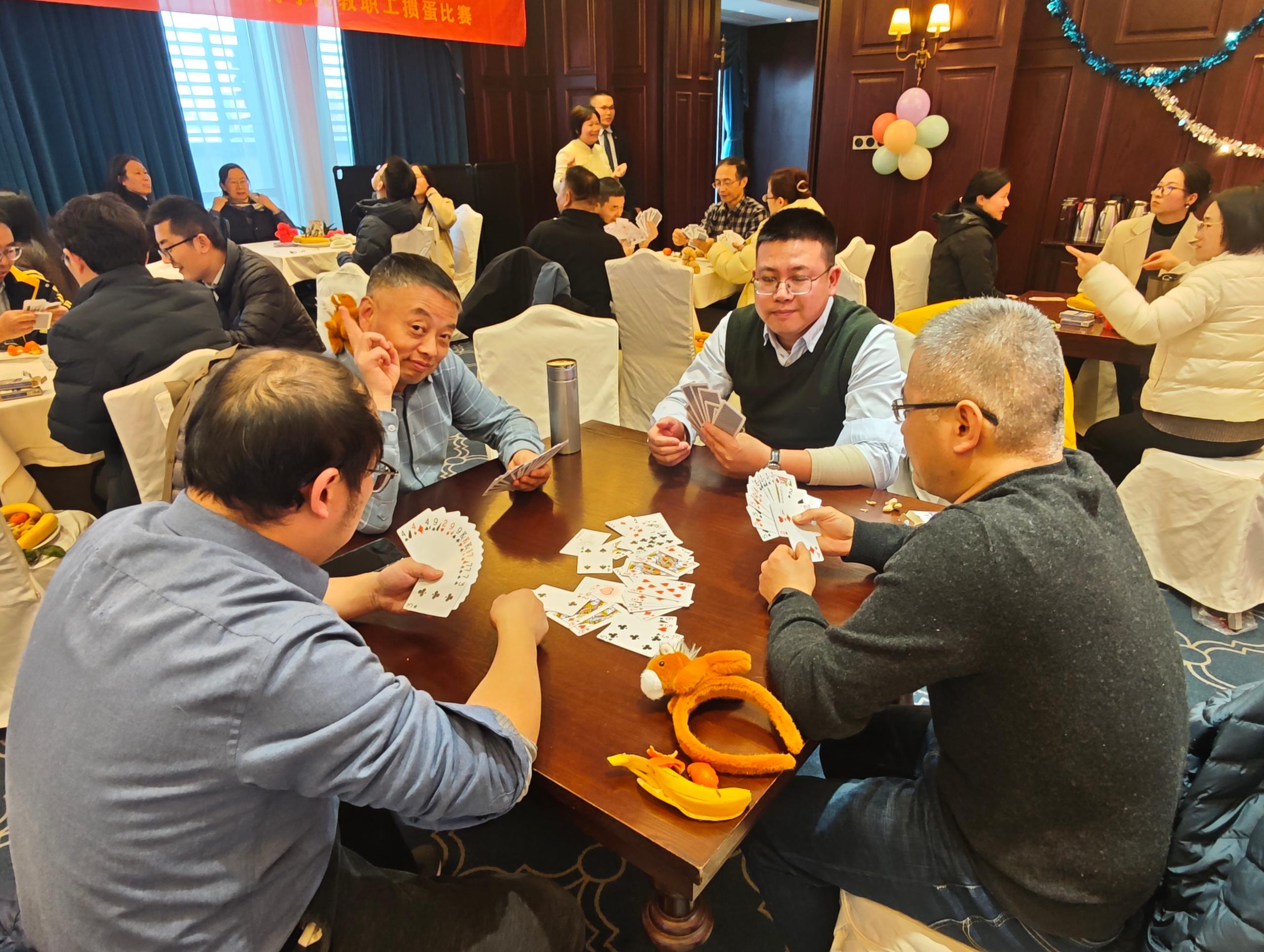 为了让老师们充分放松、深度互动,本次联欢会分充分考虑到不同年龄段老师的兴趣爱好,提前规划了多个趣味项目,老师们可以根据自己的兴趣自主选择,可以去掼蛋桌上运筹帷幄,可以去K歌区放声高歌,还可以选择轻松有趣的桌牌游戏。