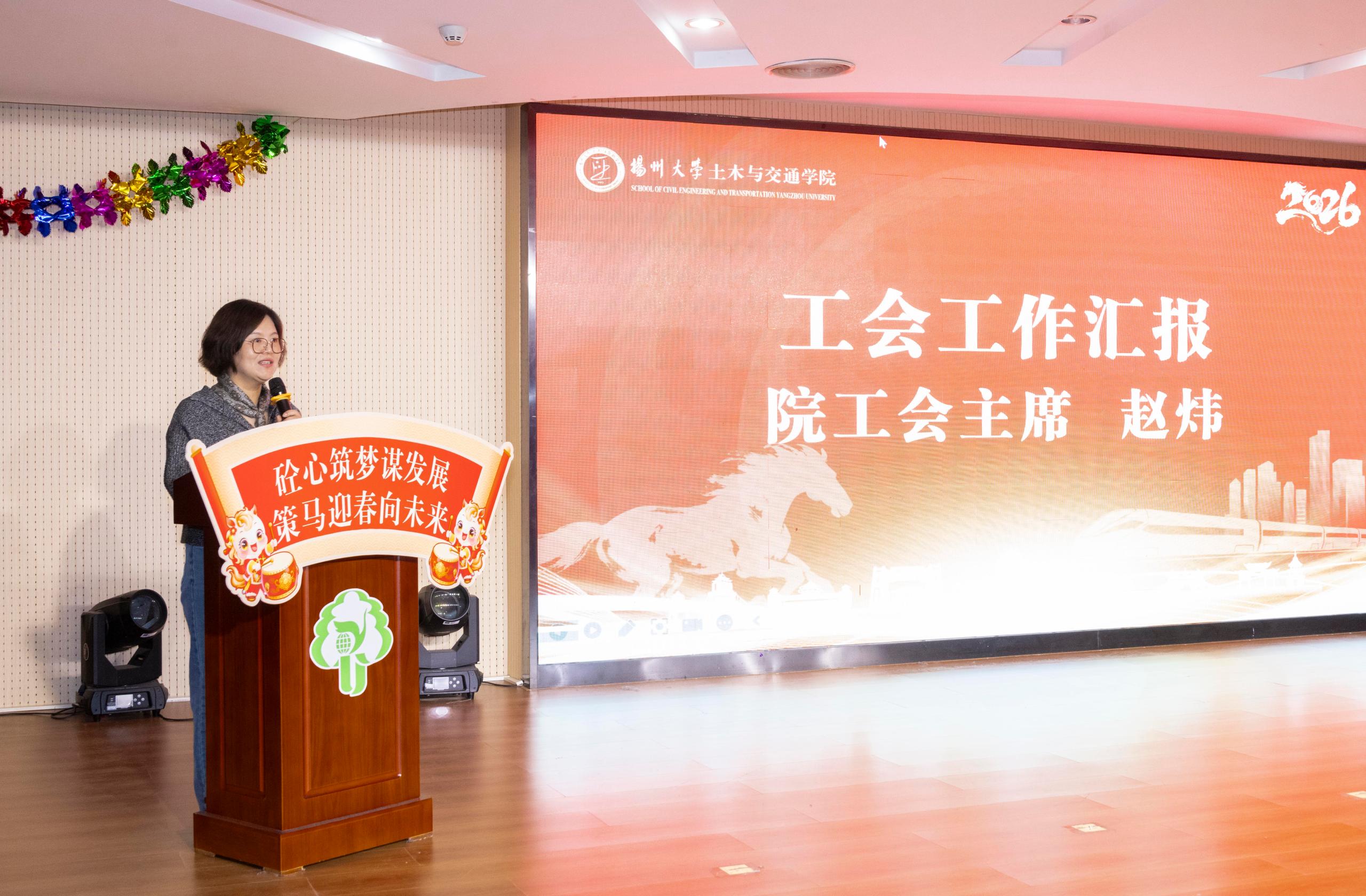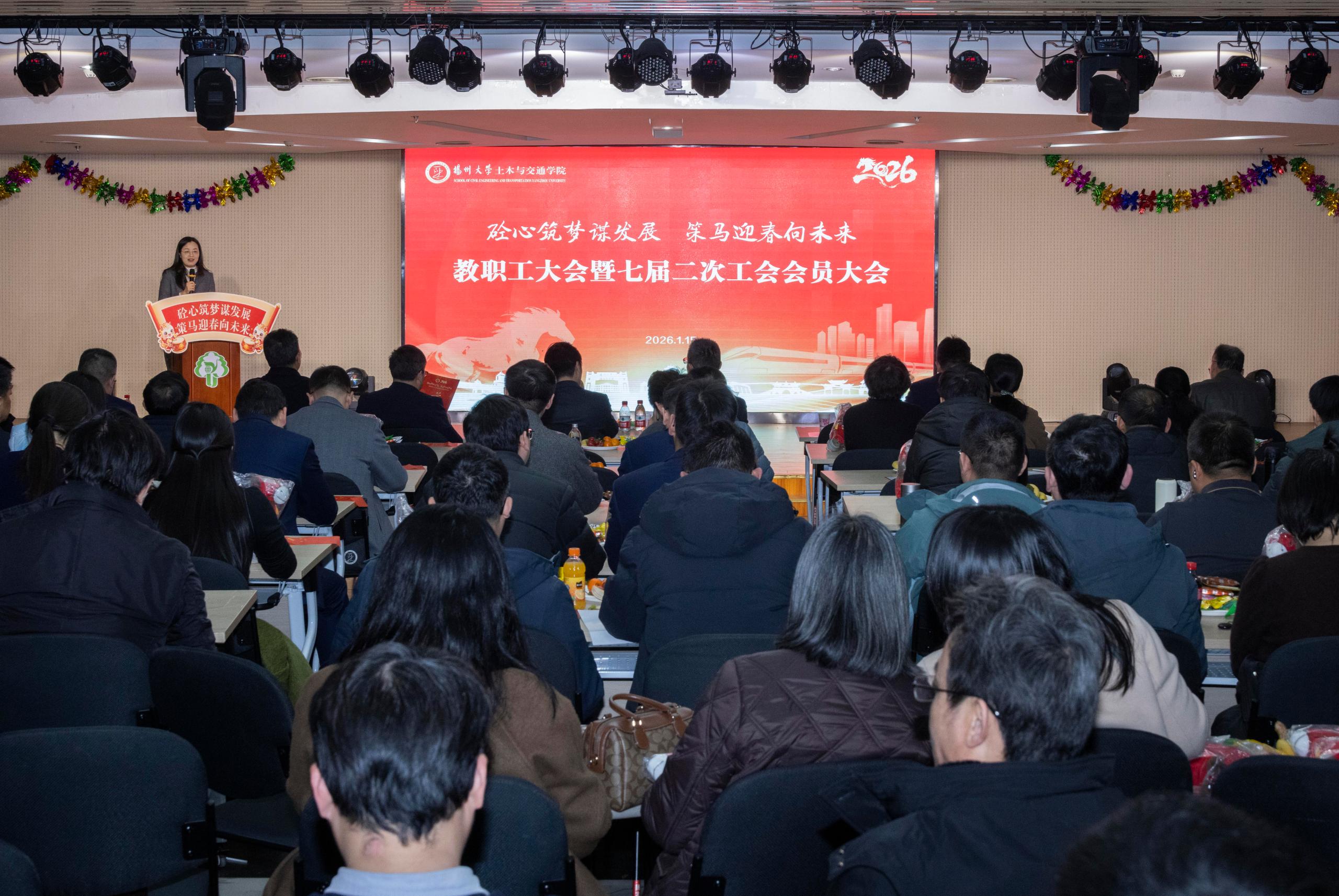 1月15日下午,土交学院在荷花池校区大学生活动中心召开七届二次工会会员大会。院长邓社军向全体教职工作2025年度学院工作报告。院工会主席赵炜作2025年度工会工作报告,围绕思想引领、暖心服务、文体活动、岗位建功等方面总结回顾全年工作,并对2026年重点打造“职工之家”、精准服务再升级进行展望。会上,党委书记张彦为荣获2025年度“文体突出贡献奖”的杨萌颁发证书。学院全体教职工欢聚一堂,总结过往、表彰先进、共迎新春,共同推进学院工会工作再上新台阶。