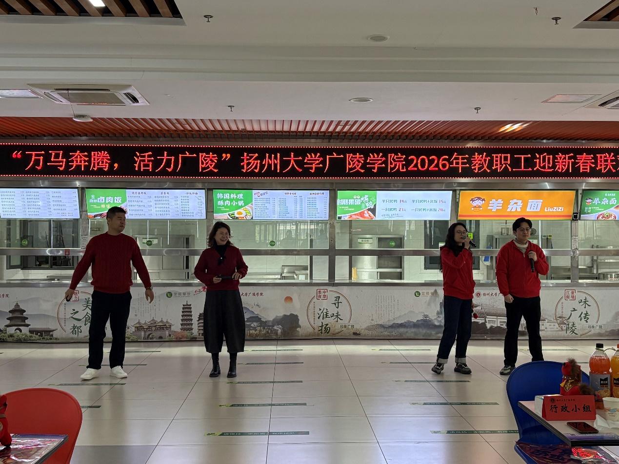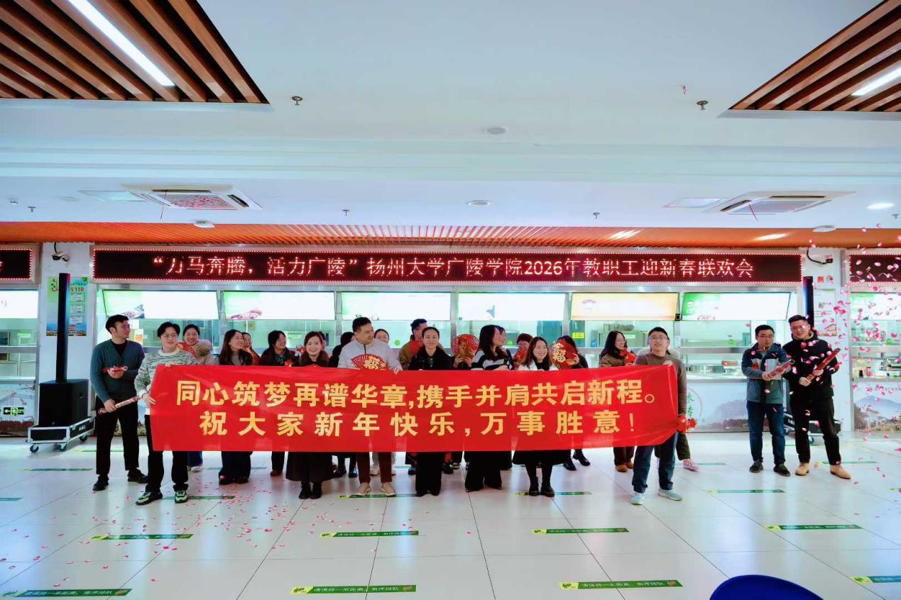 欢声笑语辞旧岁,暖意融融迎新春。2026年1月12日,扬州大学广陵学院院工会以“万马奔腾,活力广陵” 为主题,组织开展 2026 年教职工迎新春联欢会,全院教职工欢聚一堂,在包饺子、节目展演、掼蛋活动的热闹氛围中,共叙情谊、共迎马年新春。