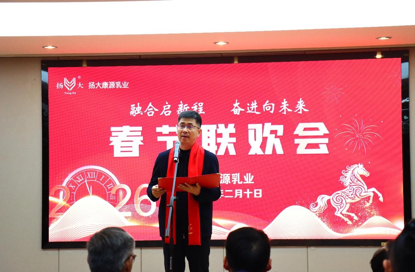 骏马迎春至,康源聚福来。值此新春佳节来临之际,为丰富实验农牧场职工的业余文化生活, 2月10日下午,实验农牧场在食品产业园场区举办2026年扬大康源乳业春节联欢会。党总支书记、场长朱春生出席活动并致辞。全体场领导,五、六级职员出席活动。