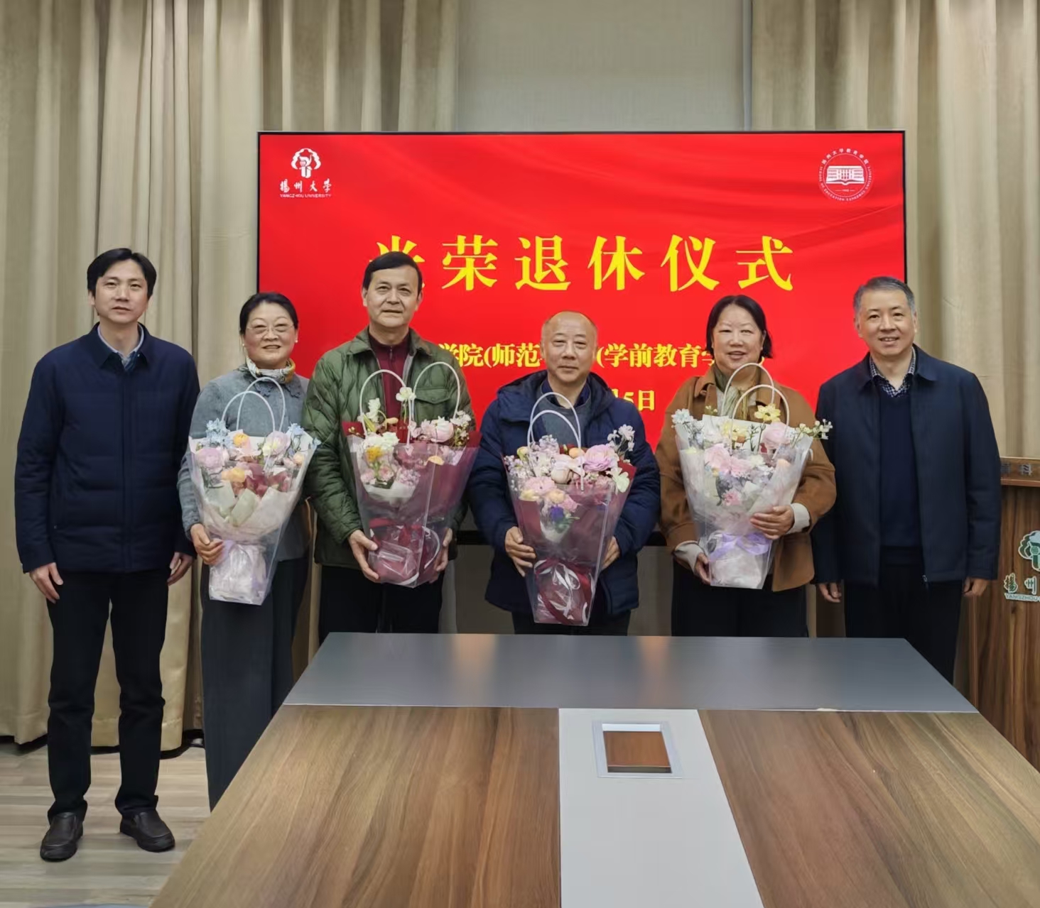 荣退仪式中,学院领导为退休教师们颁发纪念品和献花,表达尊敬和感激之情。