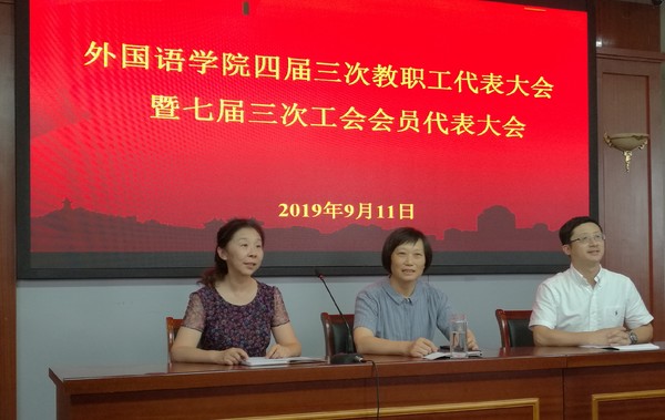 9月11日下午,外国语学院在笃行楼报告厅举行四届三次教职工代表大会暨七届三次工会会员代表大会。院“两代会”代表60多人参加会议,学院党委书记赵春丹主持会议。
