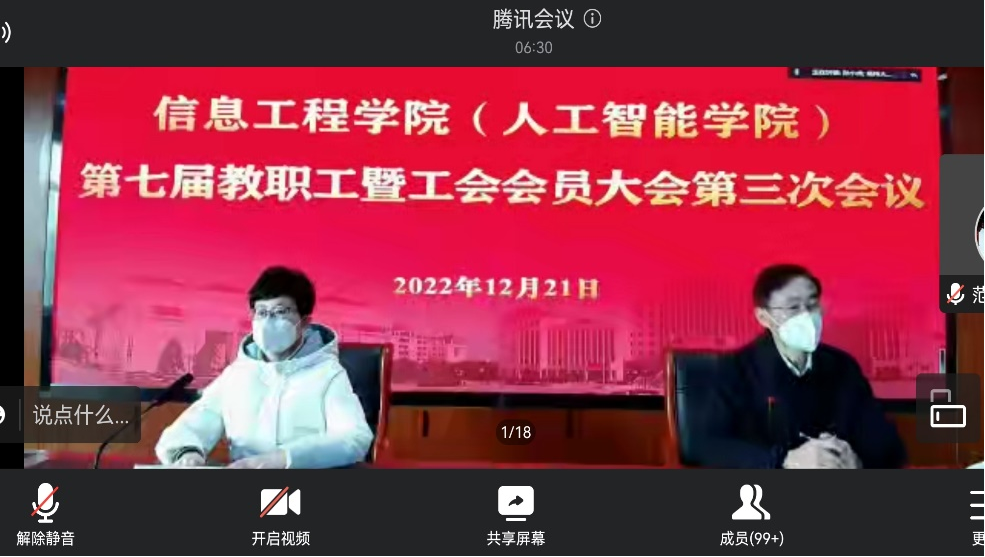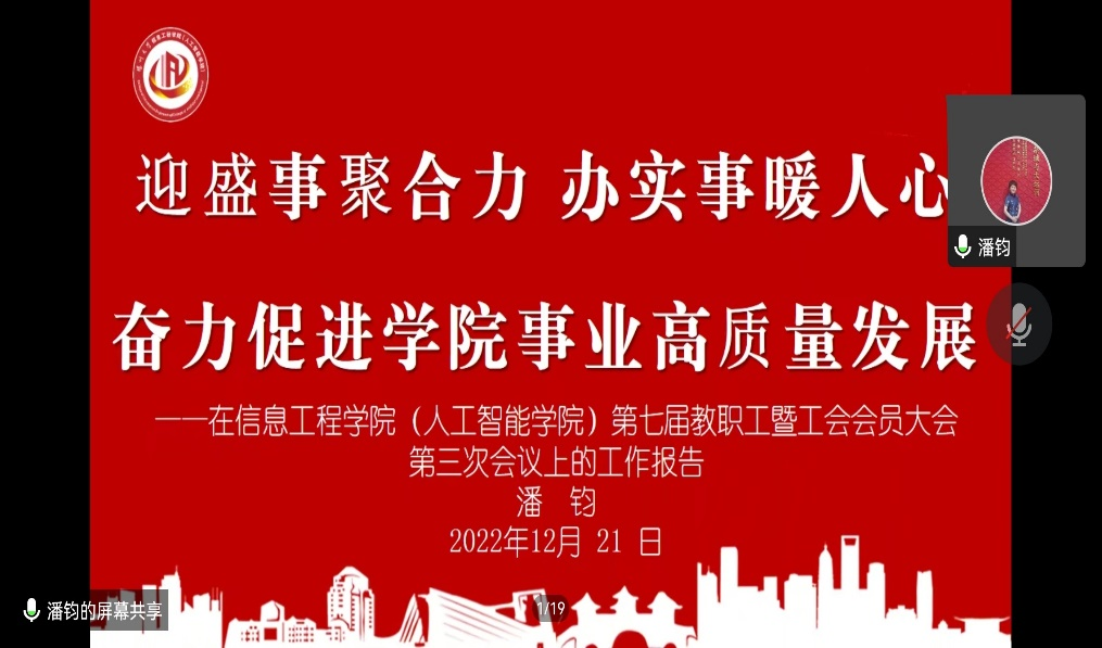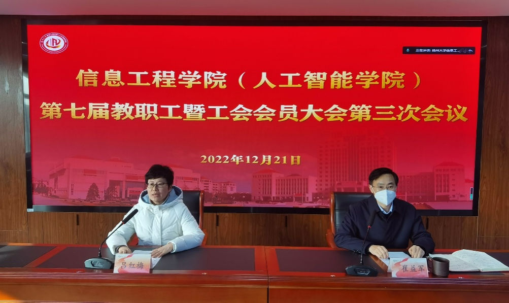 2022年12月21日下午,信息工程学院隆重召开了第七届教职工暨工会会员大会第三次会议。院党委书记吕红梅出席会议并发表讲话。大会听取并审议了院长孙小兵所作的《踔厉奋发笃行不怠聚力推进高水平研究型学院建设再迈新台阶》工作报告,审议通过了院工会主席潘钧所作的工会工作报告。院党委副书记崔益军主持会议。