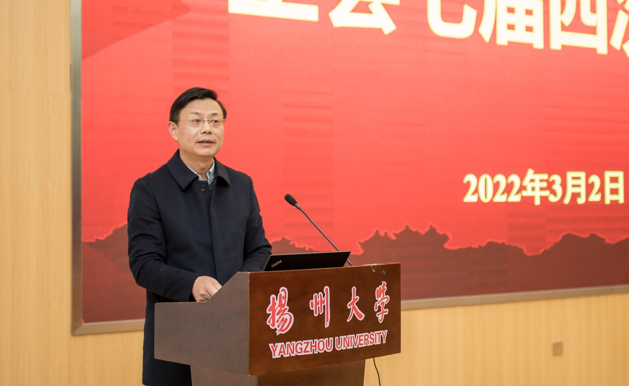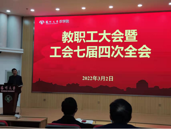 3月2日下午,农学院在逸夫馆报告厅召开七届四次工会会员大会。会议由严长杰院长主持并作院长工作报告,院党委书记王军作总结讲话,全院教职工参加了会议。