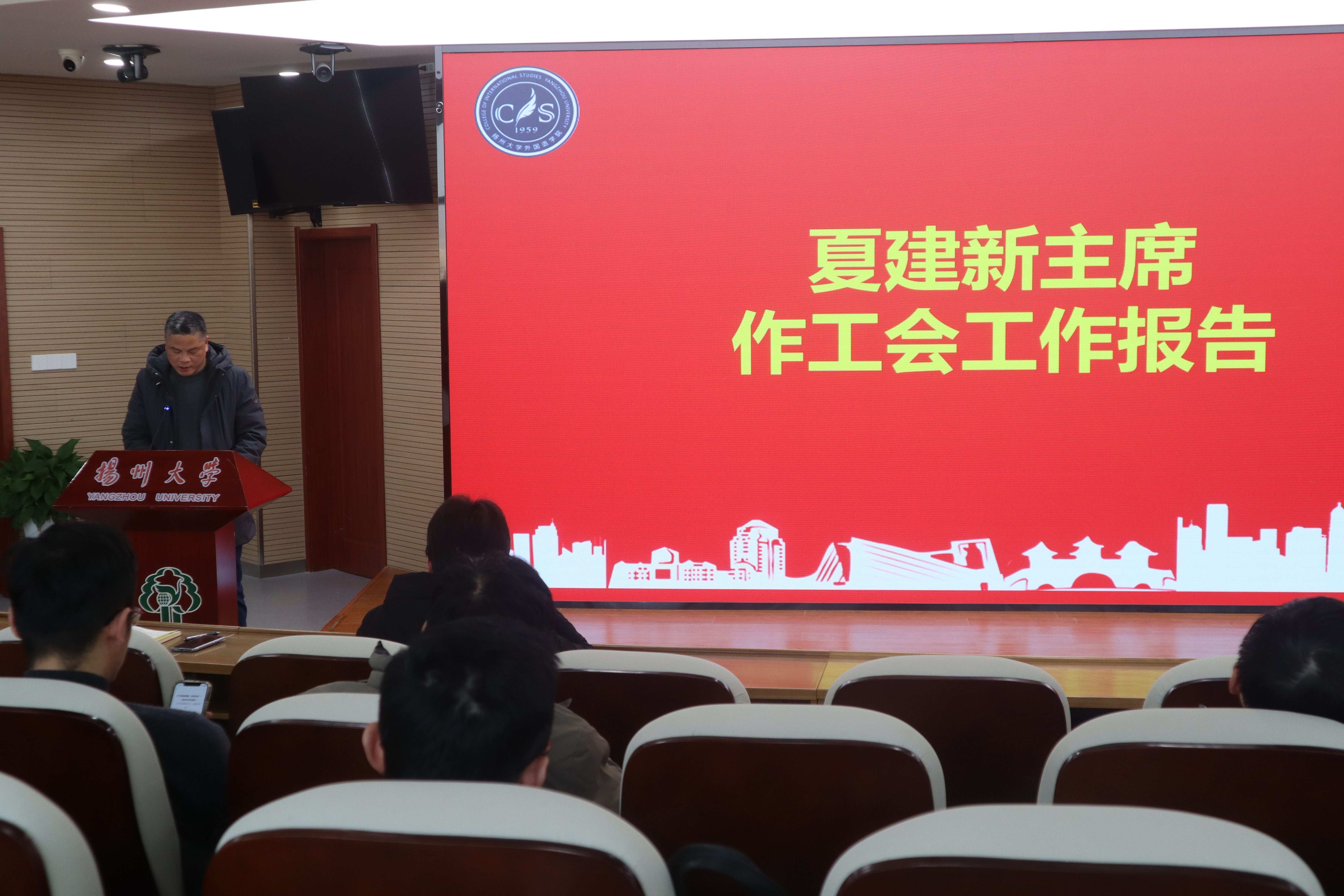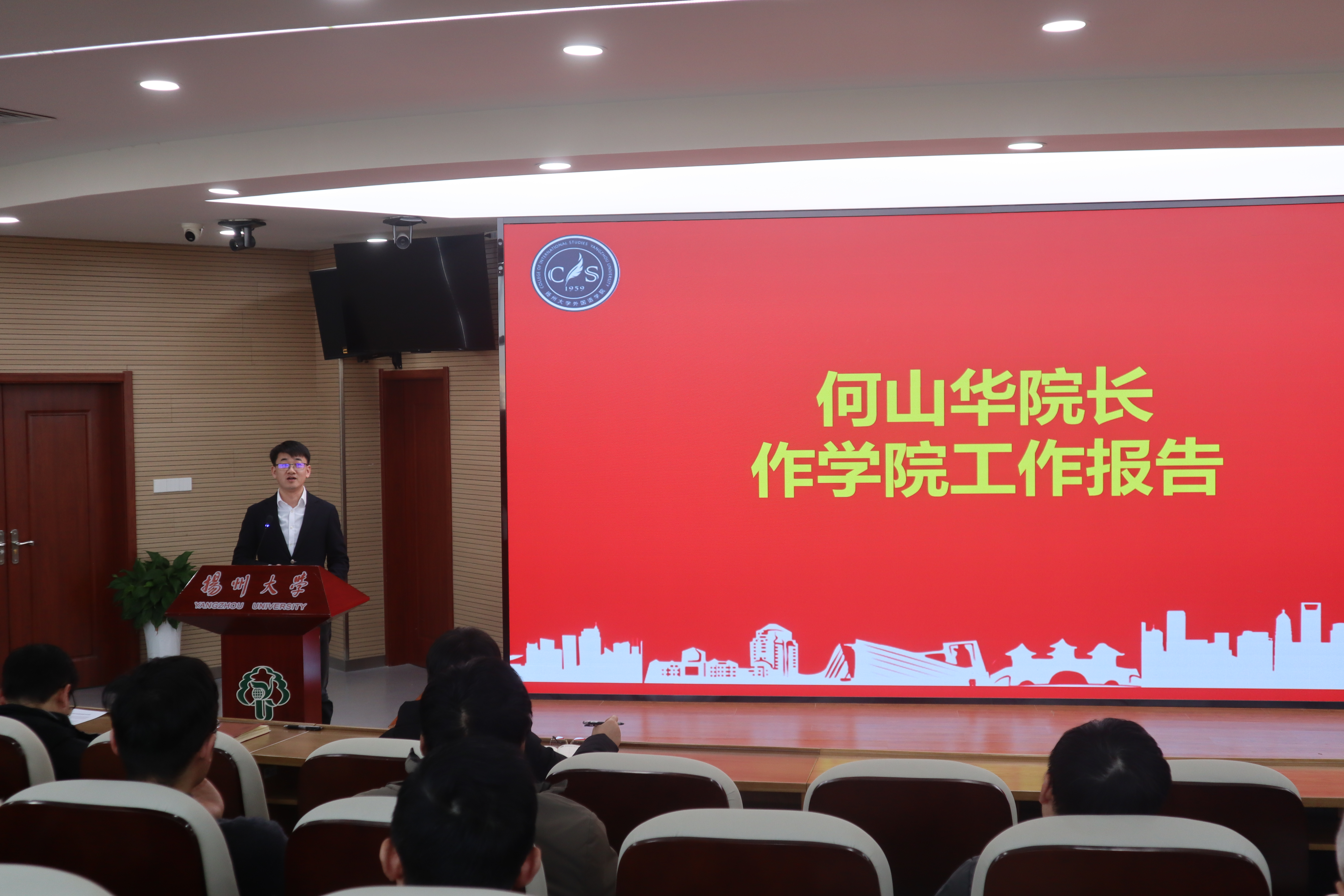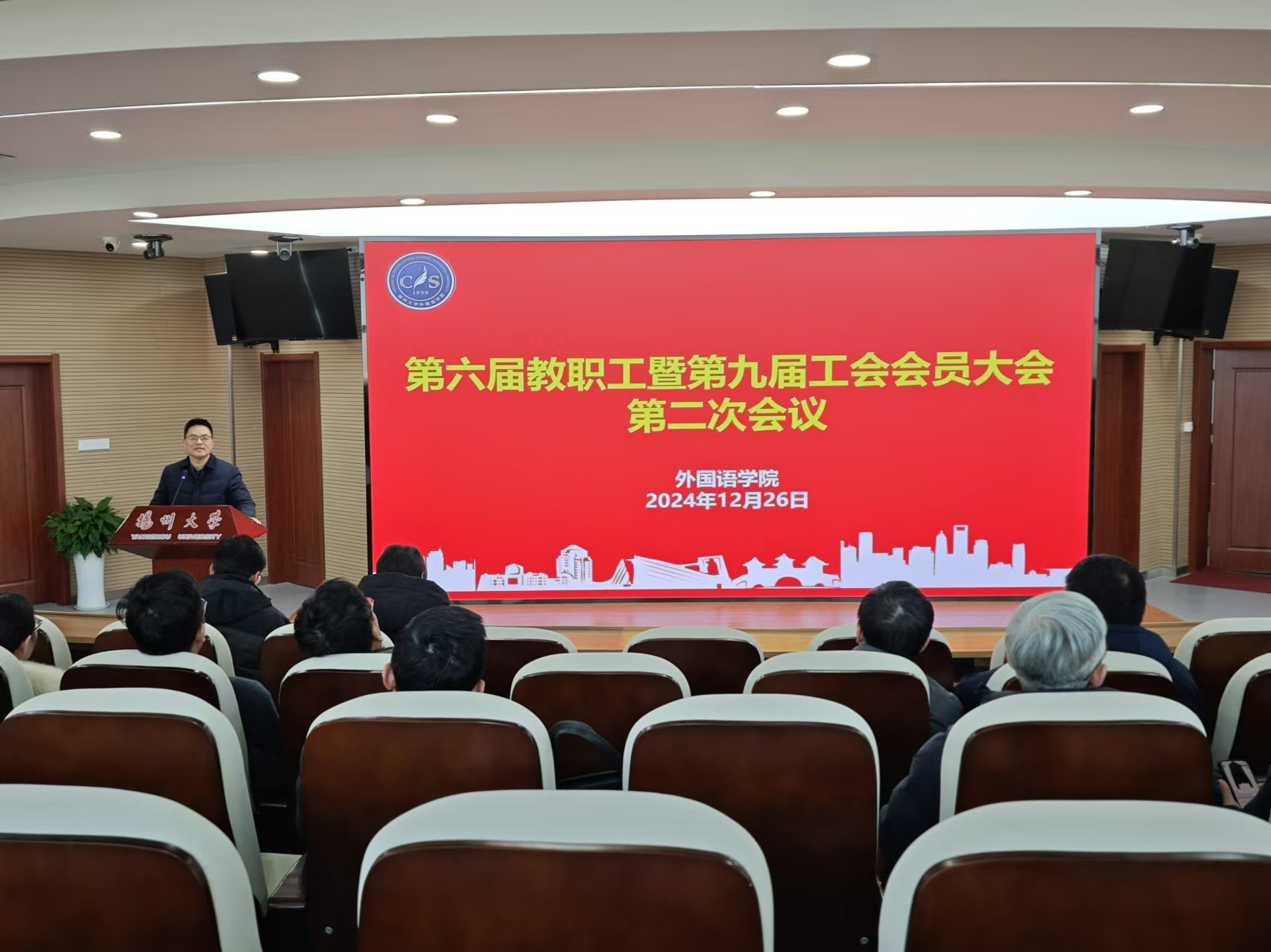 12月26日下午,外国语学院在笃行楼N402报告厅召开第六届教职工暨第九届工会会员大会第二次会议,会议由学院党委书记居学明主持,全体院领导、全体教职工(工会会员)参加会议。