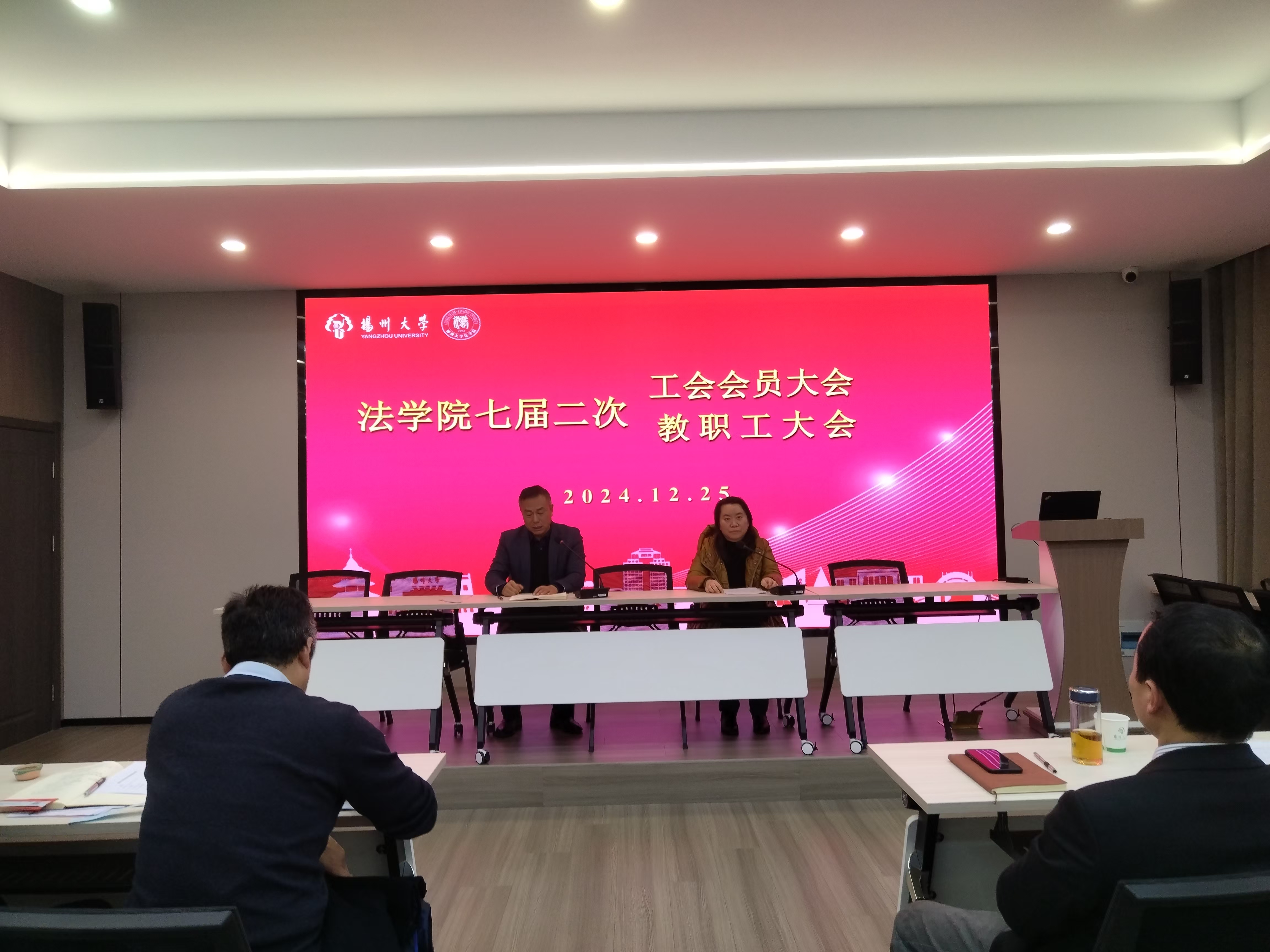 12月25日下午,法学院在扬子津校区笃行楼三楼模拟法庭召开七届二次教职工大会暨七届二次工会会员大会。会议由院党委花瑞锋书记主持,全体教职工参加会议。