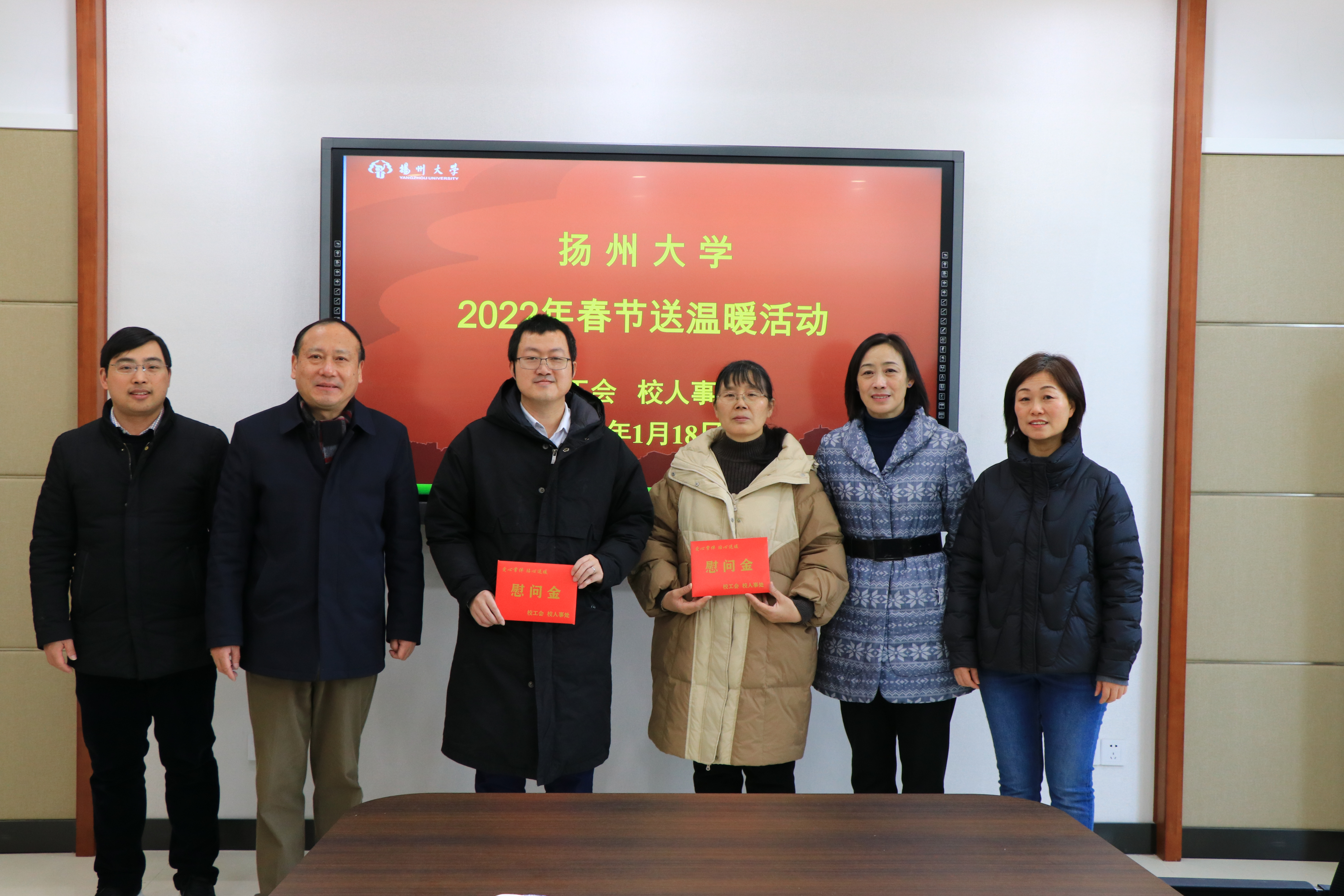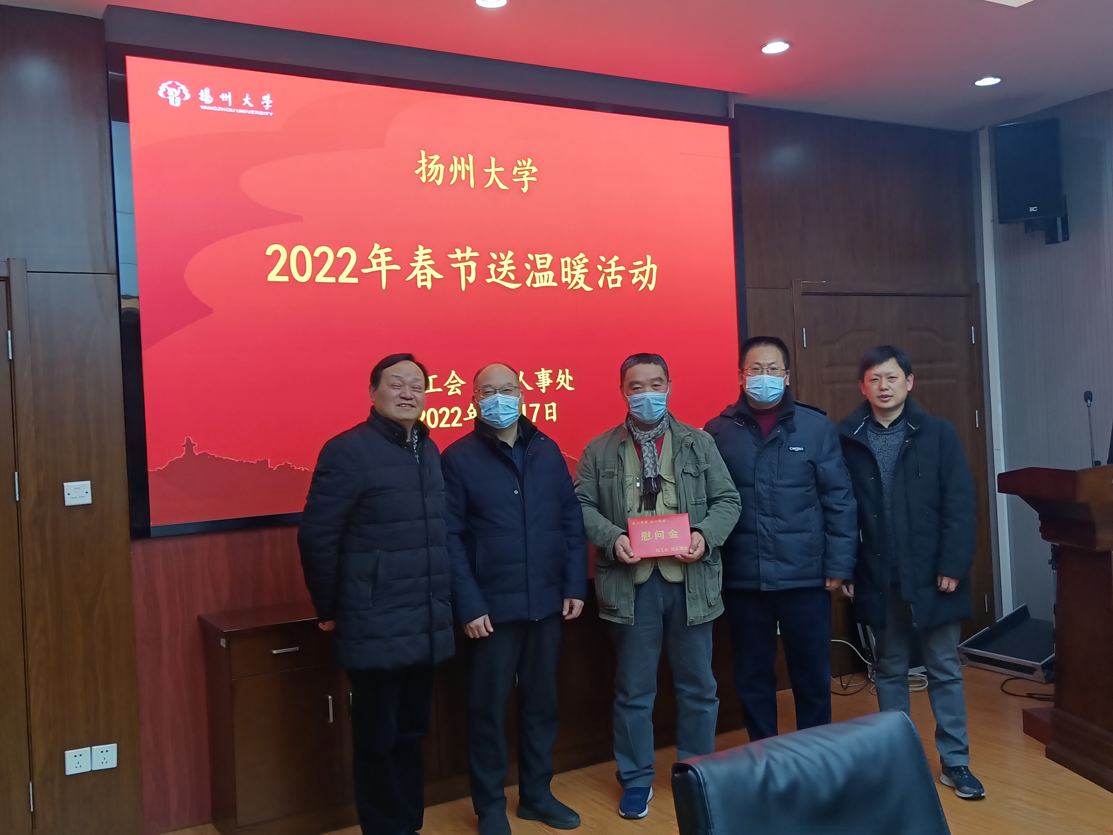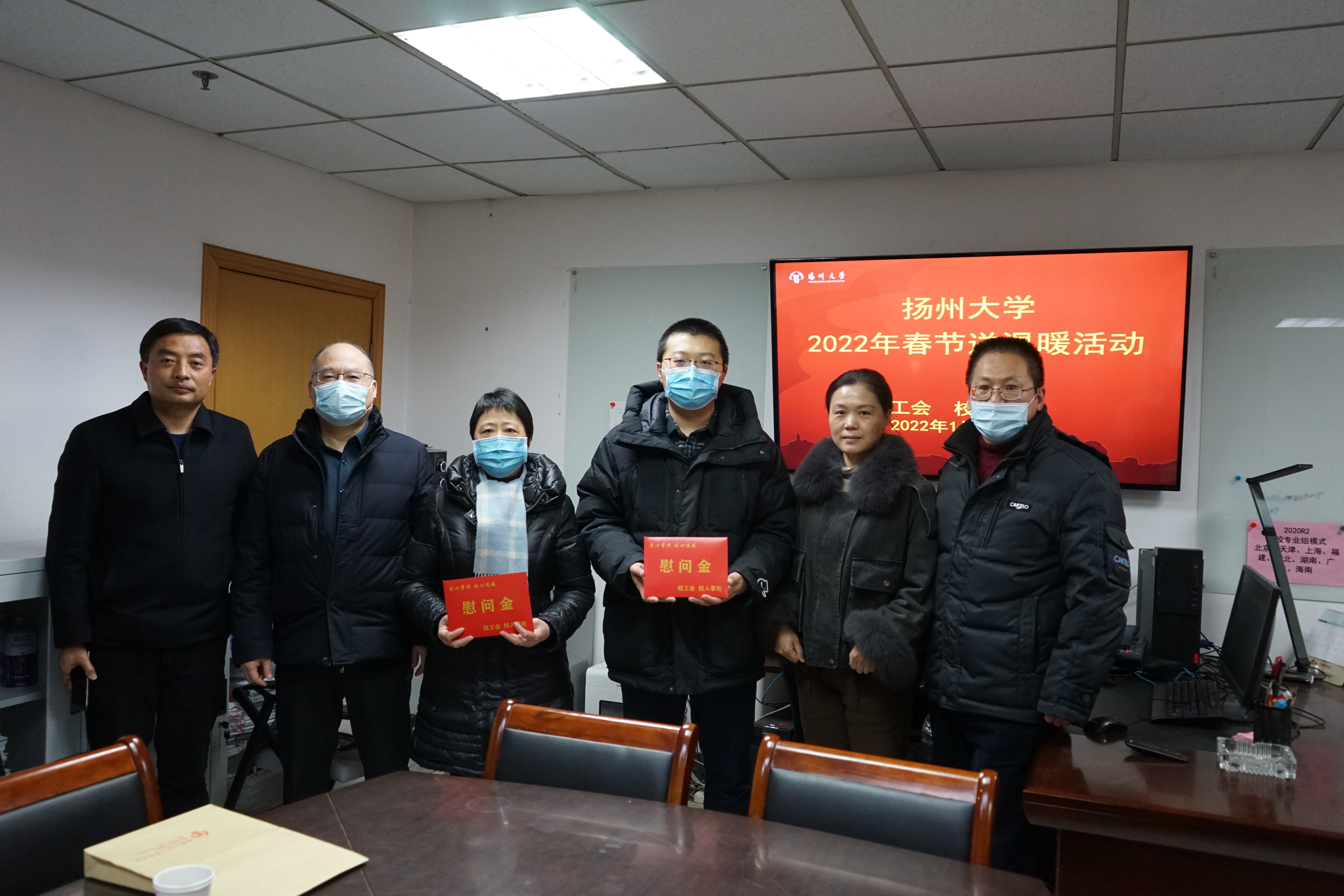 1月12日,江苏省教育科技工会一级调研员孙焱一行到扬州大学看望慰问了市“五一劳动奖章”获得者、疫情防控一线员工、因病致困教职工代表,向他们送上了新年的问候和祝福。市教育科技工会主任钱永羊陪同慰问。校工会主席高远、相关二级工会负责同志及工会主席参加慰问。