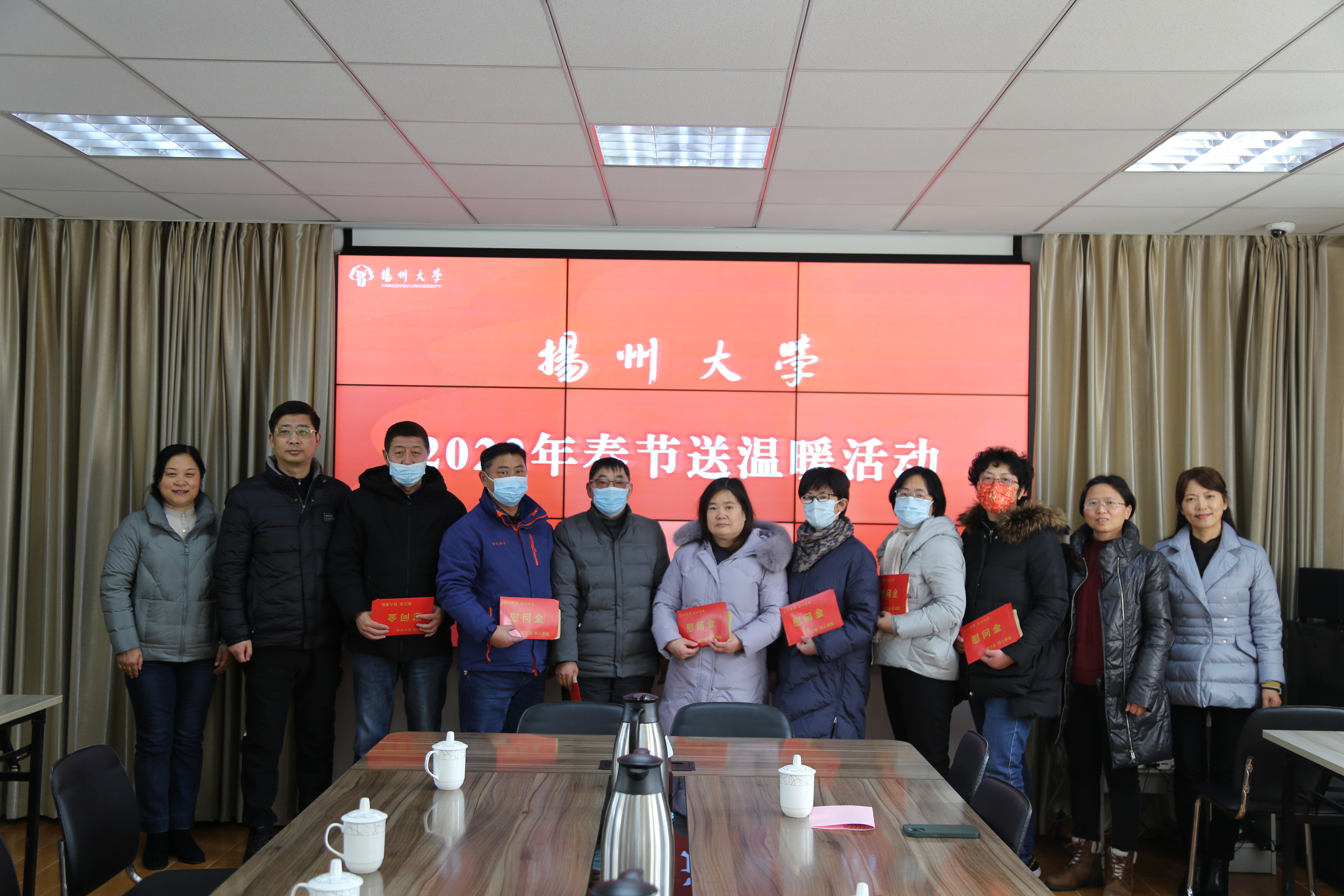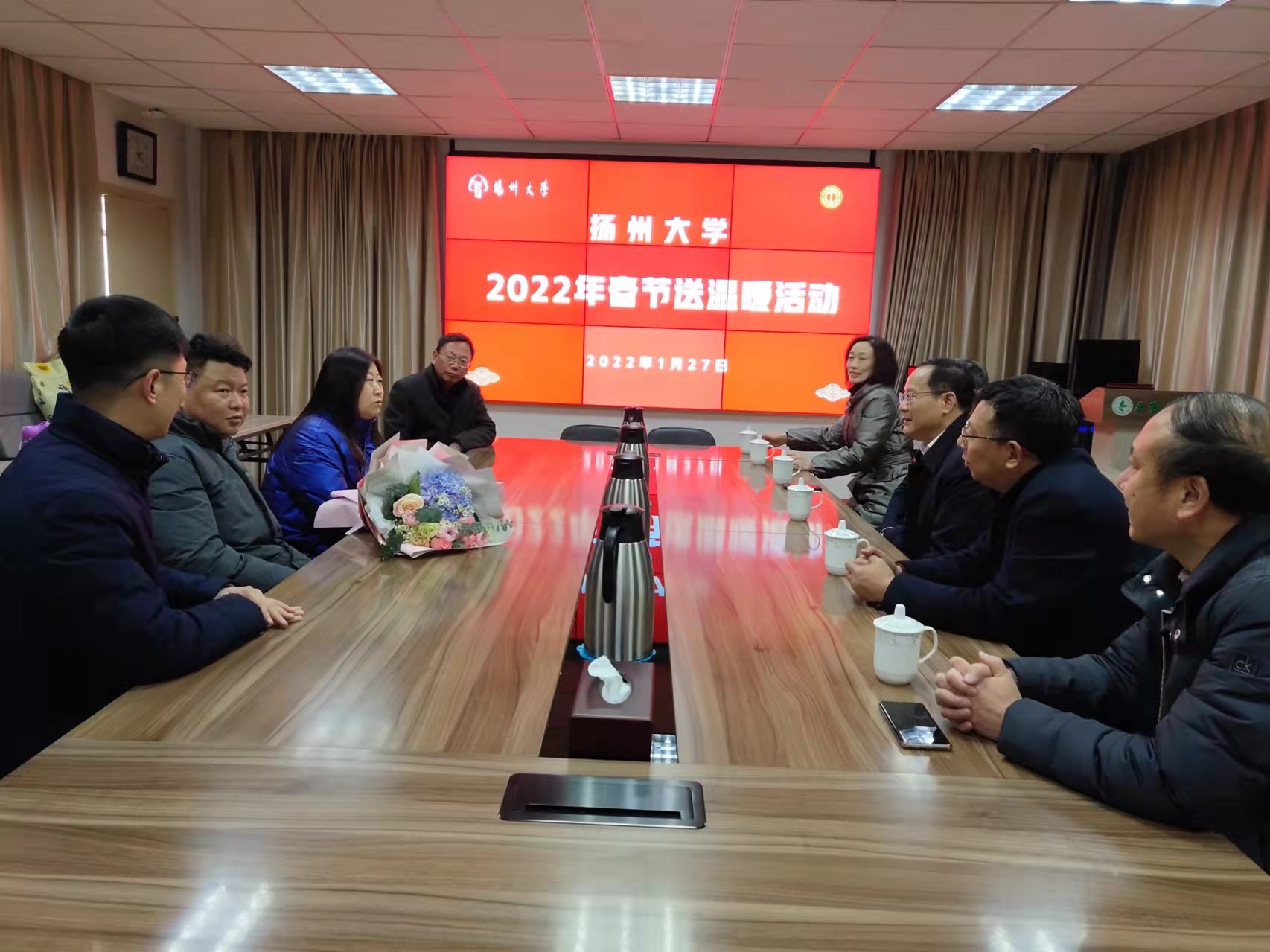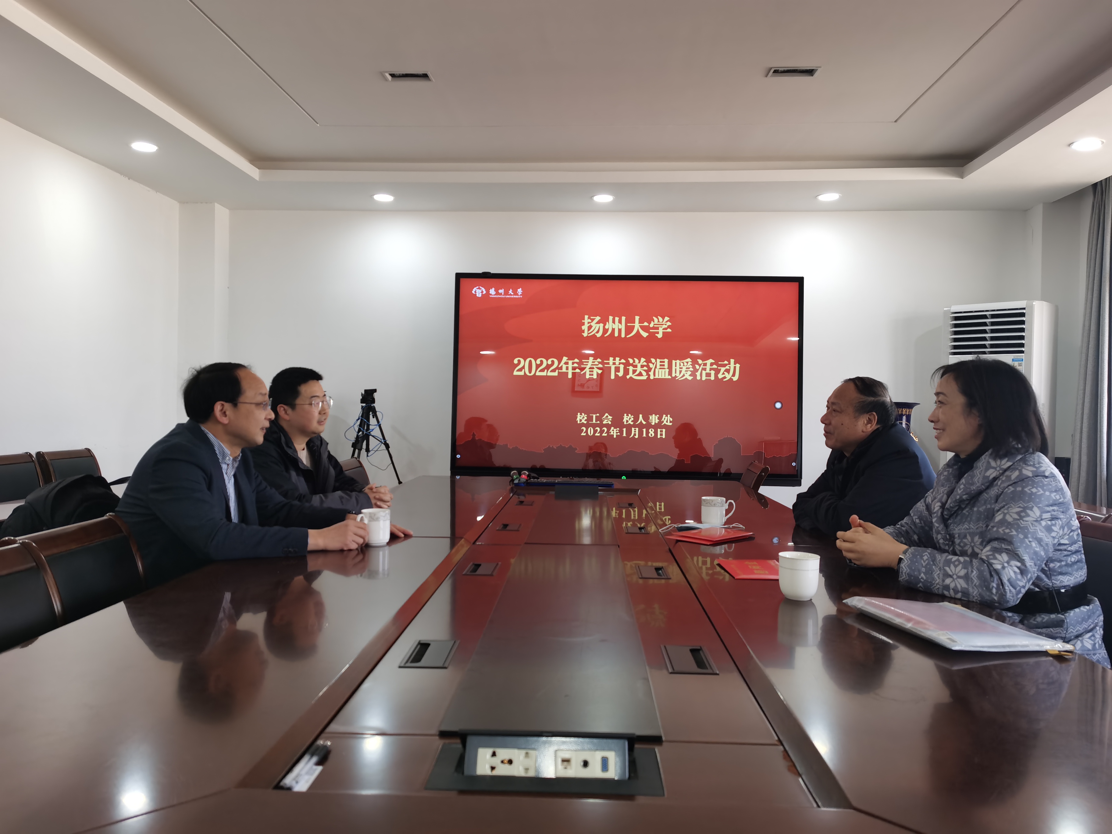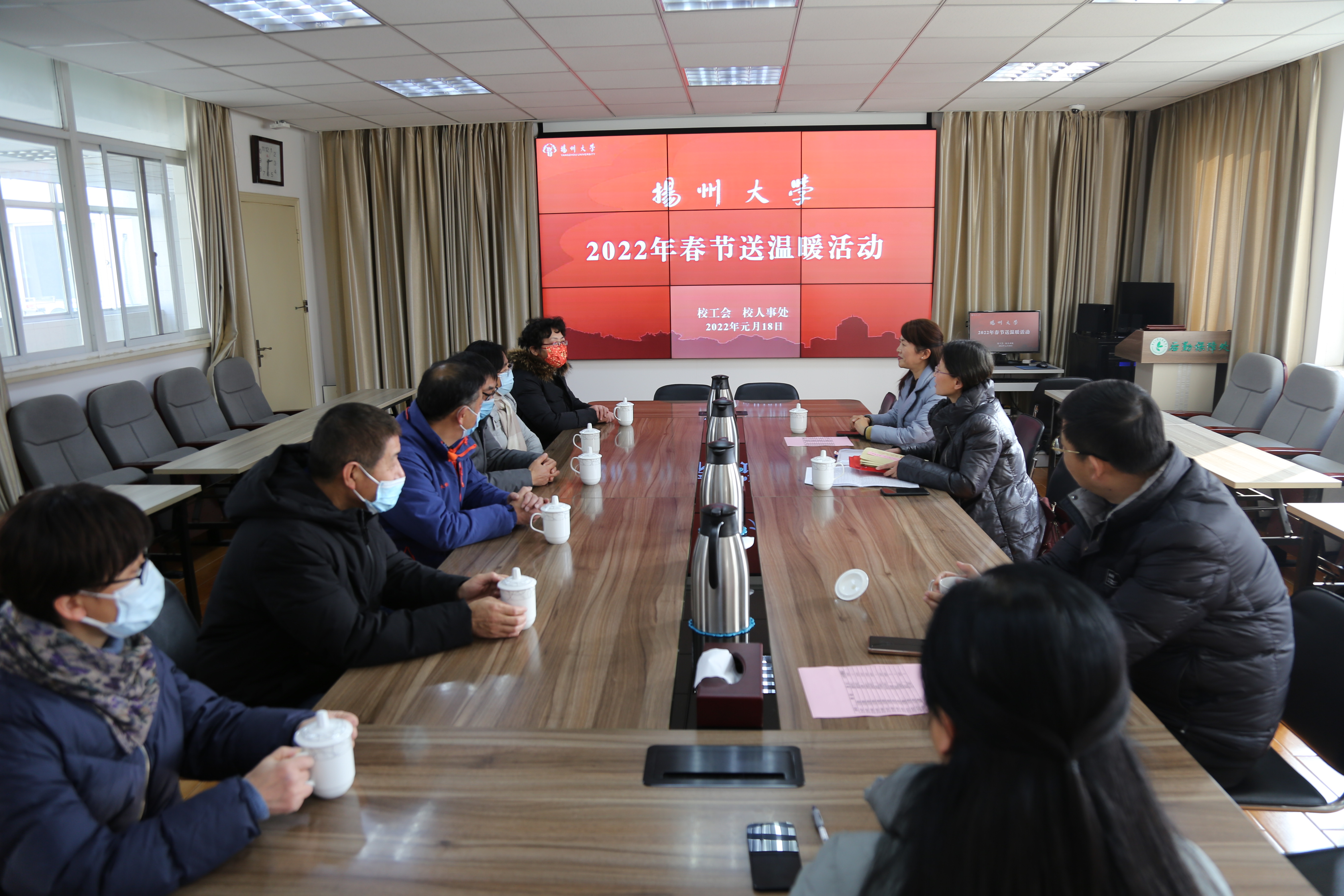 1月12日,江苏省教育科技工会一级调研员孙焱一行到扬州大学看望慰问了市“五一劳动奖章”获得者、疫情防控一线员工、因病致困教职工代表,向他们送上了新年的问候和祝福。市教育科技工会主任钱永羊陪同慰问。校工会主席高远、相关二级工会负责同志及工会主席参加慰问。