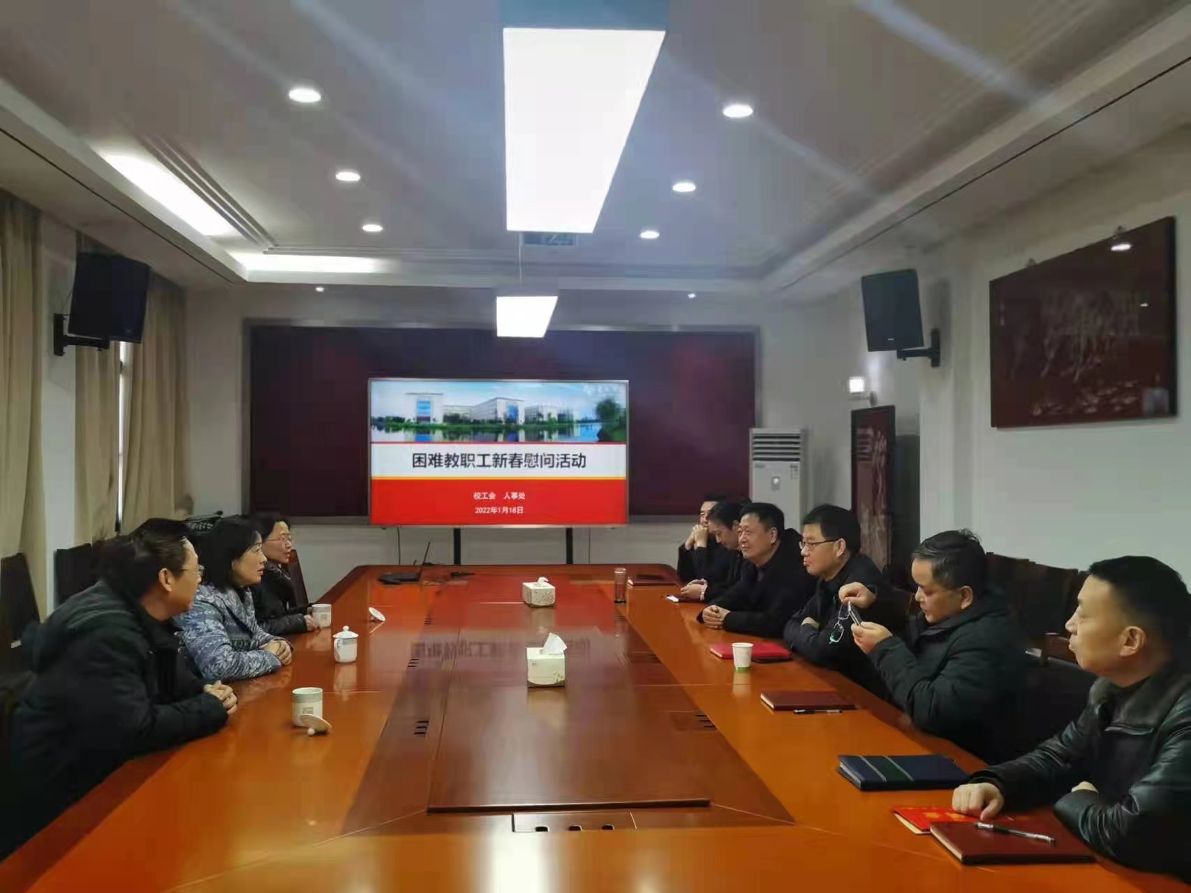 1月17日-18日,校工会主席高远、校人事处处长孙鹏,工会副主席朱华光、人事处副处长汤学军,工会副主席高静、人事处副处长潘俊等组成三个慰问组,深入二级工会走访慰问教职工,为他们送上工会的温暖和新春祝福。相关二级工会负责同志及工会主席参加慰问。
