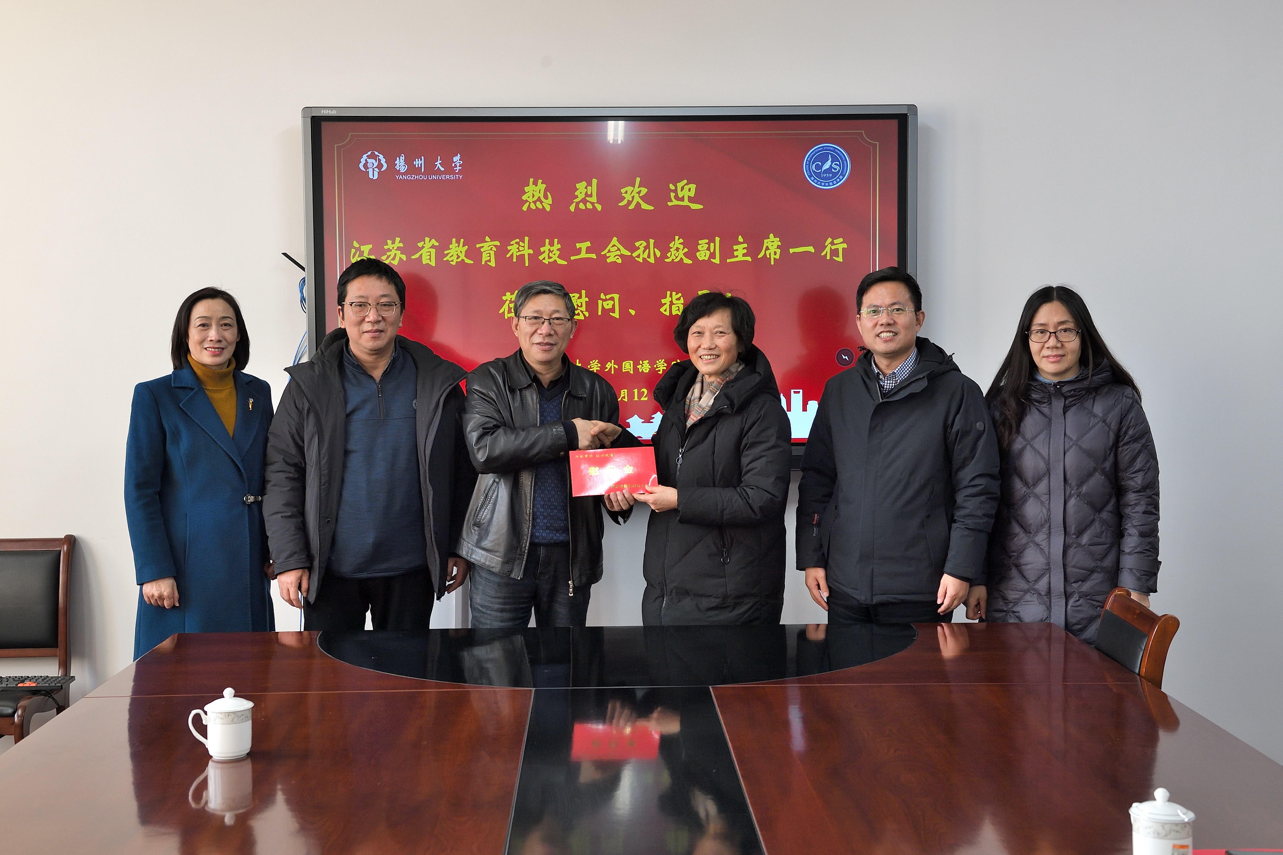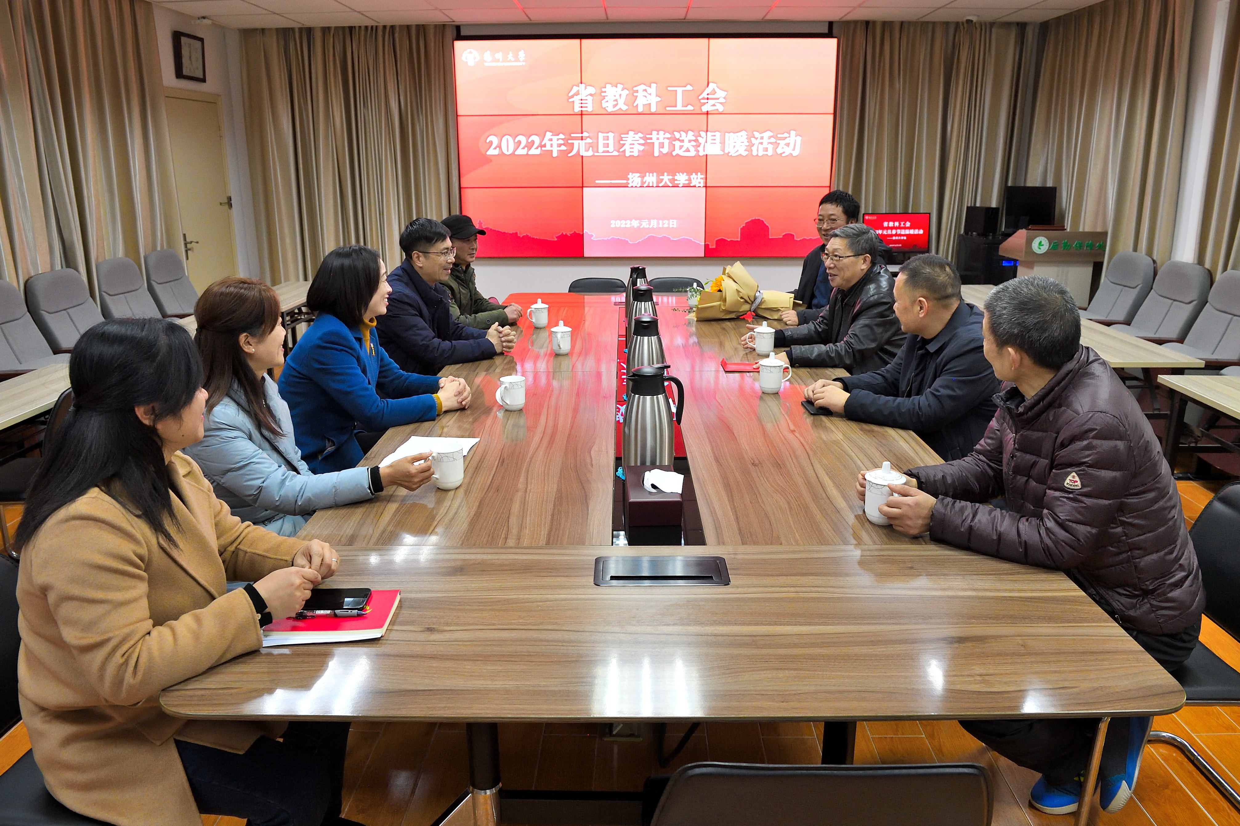 1月12日,江苏省教育科技工会一级调研员孙焱一行来我校看望慰问了市“五一劳动奖章”获得者、疫情防控一线员工、因病致困教职工代表,向他们送上了新年的问候和祝福。扬州市教育科技工会主任钱永羊陪同慰问。校工会主席高远、相关二级工会负责同志及工会主席参加慰问。