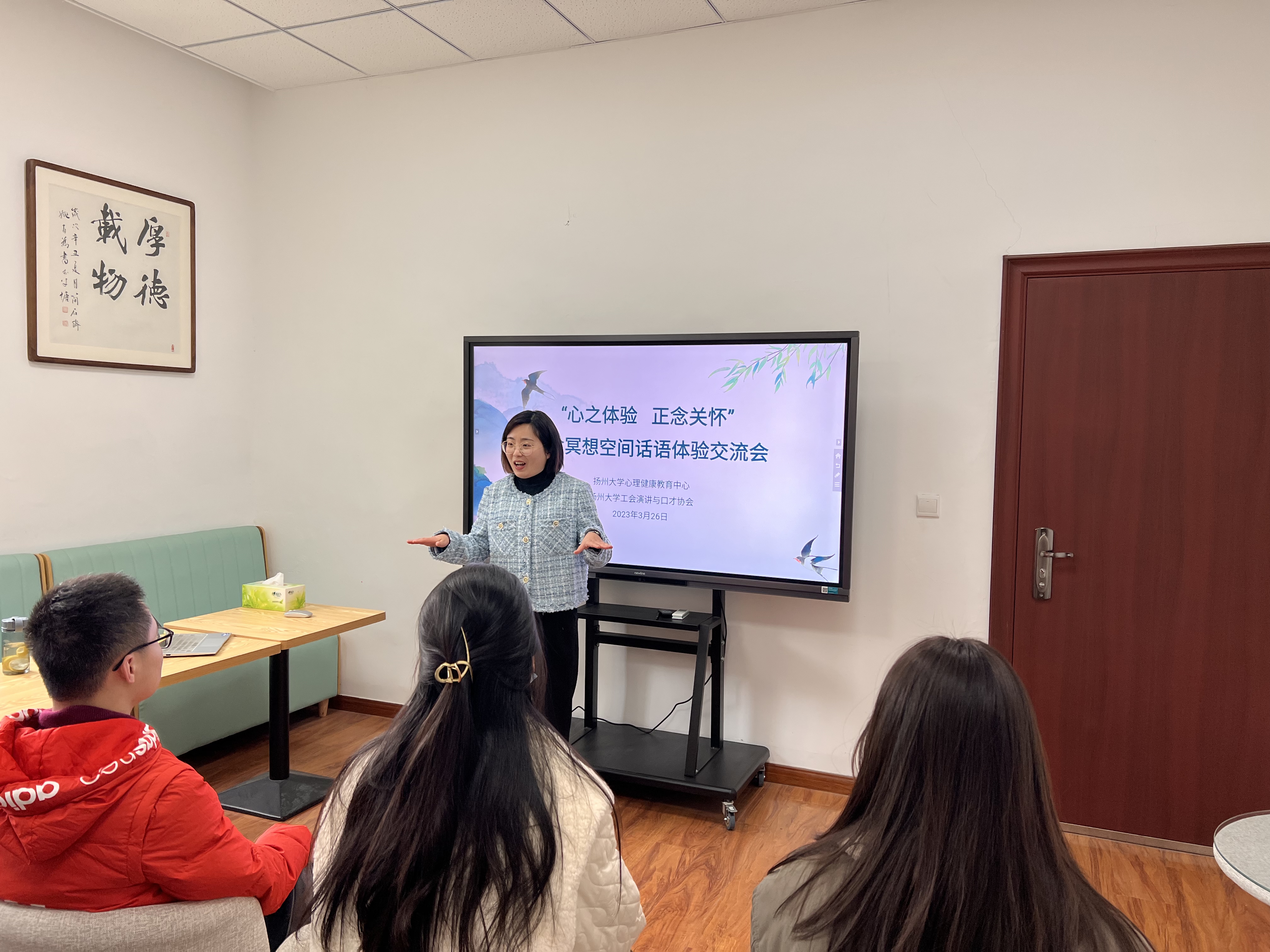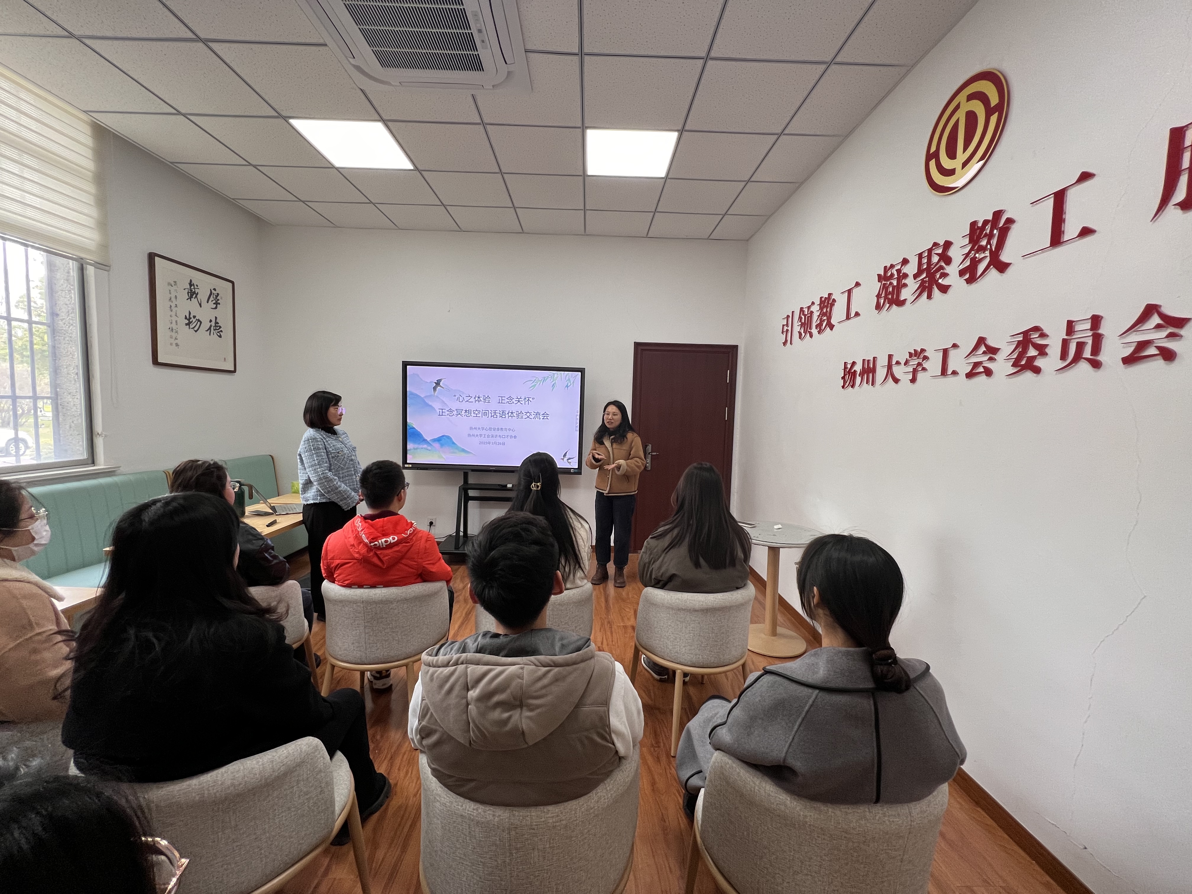 3月26日下午,在文汇路校区工会教职工书吧,学校心理健康教育中心与工会演讲与口才协会共同举办了“心之体验 正念关怀”——正念冥想空间话语体验交流会。心友社副社长王悦带领着现场师生们一起开启感官复苏的正念体验之旅。校工会演讲与口才协会会长柏程伟、副会长张硕参与活动。