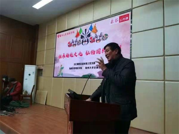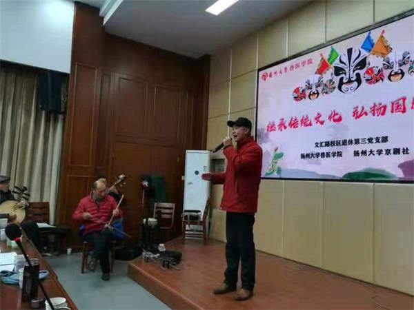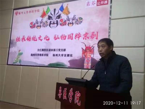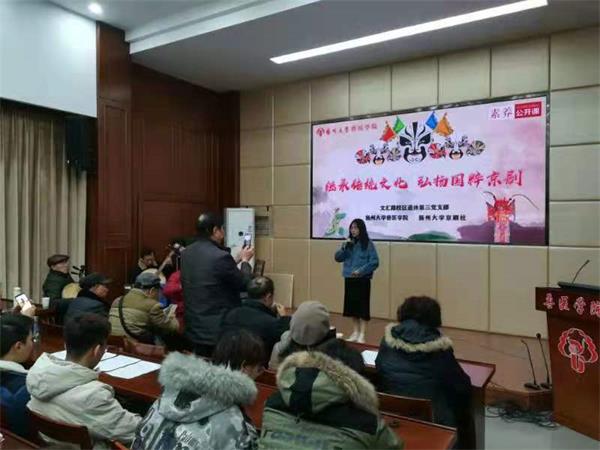 十二月十一日晚,由扬州大学京剧协会与文汇路校区退休第三党支部以及扬大兽医学院学生,以“继承传统文化、弘扬京剧艺术”为主题,举行专题共建京剧演讲、演唱会。活动在兽医学院大楼二楼报告厅举行,共有近百名师生参加了这次活动。