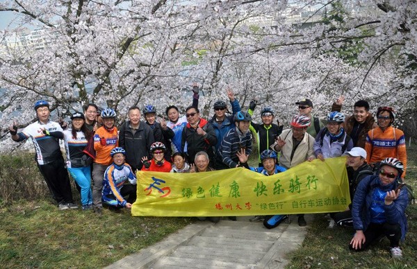 3月20日,教职工“绿色行”自行车骑行协会与广陵骑士团合作,顺利完成了句容下蜀空清山行,60多名自行爱好者组成的车队浩浩荡荡沿着润扬路、瓜洲渡、G312向镇江句容挺进,骑友们五颜六色的服装和沿途各色盛开的春花争奇斗艳。跨过长江,地势渐有起伏,笔架似的小山也不时映衬左右,大家首先来到下蜀的长江提水一站,这里的樱花开的正艳,随后又沿X202乡道进入山区,一段连续的长陡坡让不少骑友只能下车推行,但征服它的感觉也很爽。本次骑行约110公里,不少会员都突破了自我,广陵骑士团骨干的热情、老练、无私;会员徐教授细心到位的保障;会长的精确指导及每一位会员的相互帮助、关心、提醒是活动成功的保证。“高帅哥”、“金美女”独自追赶团队、外教John的参与也成为活动的亮点!